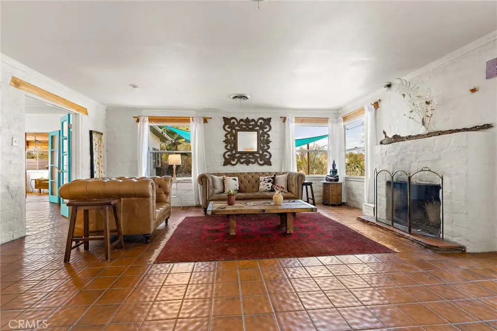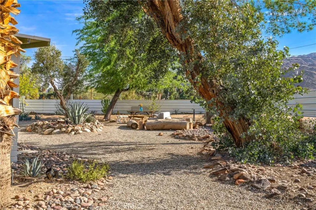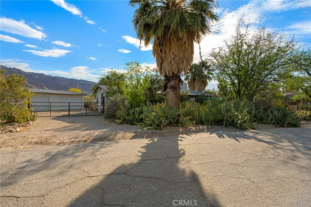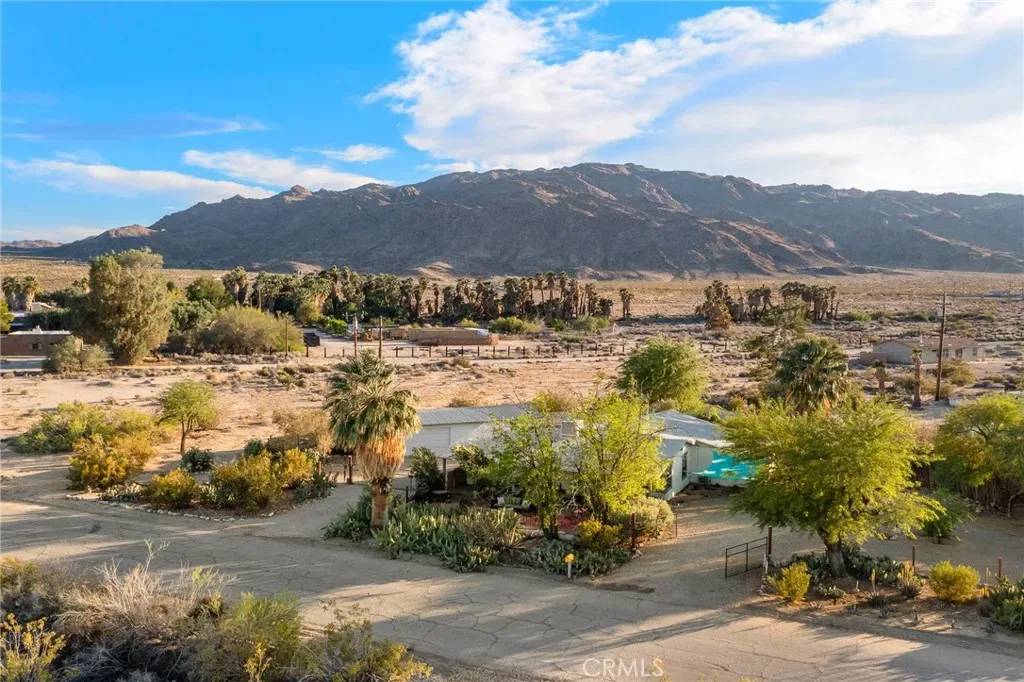 HISTORIC 1938 ADOBE: This architecturally significant property – featured in Historic Adobe Homes magazine – offers timeless desert appeal. Located within walking distance to the iconic 29 Palms Inn, Kitchen in the Desert and downtown Twentynine Palms, providing a rare opportunity to own an authentic adobe home in one of the town’s most desirable settings. Situated on a .51-acre triangular parcel uniquely positioned so the point of the lot faces directly toward the iconic Oasis of Mara, creating a setting that feels deeply connected to this remarkable natural landmark. Set against the mountains in a prime Twentynine Palms location, the property enjoys beautiful back views of the mature palm groves, with towering palms, mature trees, cactus gardens, and a peaceful breeze from the nearby natural spring pond adding to the sense of a true desert oasis. The home is surrounded by vacant lots on two sides, enhancing the sense of seclusion and making the parcel feel unusually expansive and private. This 3-bedroom, 2-bath home spans 1,491 square feet, with a layout that creates an easy connection to the outdoors, as most rooms have direct access outside, blending indoor and outdoor living. Recent improvements include new windows, a new water heater, a new kitchen counter, and new ductless mini-split heating/cooling system for efficient year-round comfort. The home also features a wood-burning fireplace for ambiance, a front porch facing open desert vistas and lush gardens for morning or evening beverages, in addition to an outdoor shower, private backyard, 4-car garage, and a 220V hookup ready for a future hot tub.