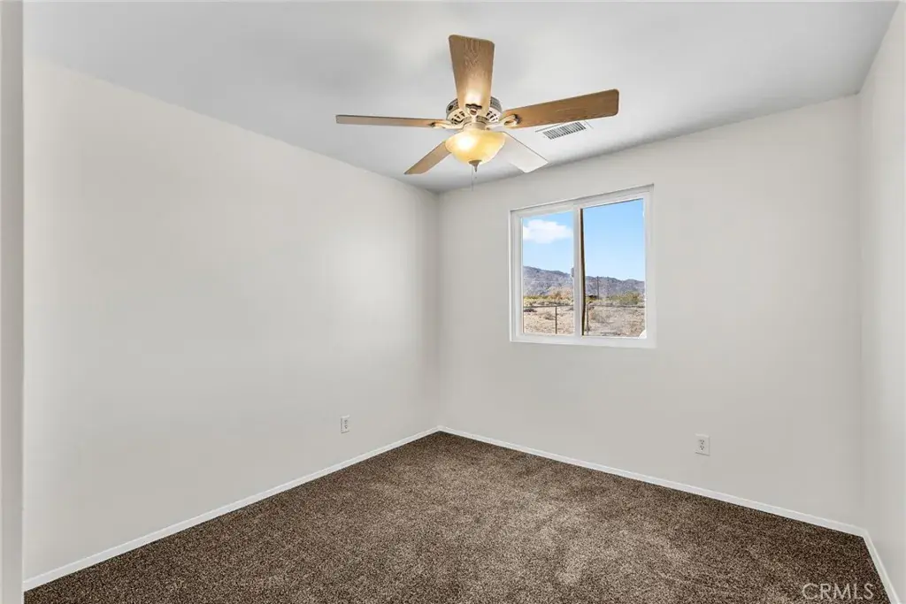 Welcome to this charming 3 bedroom, 2 bathroom home offering 1,120 square feet of comfortable living space in the Hanson area of Twentynine Palms. Perfectly suited for first-time buyers, this light and bright home features a functional layout and inviting spaces designed for everyday living. The kitchen is a standout with crisp white cabinetry, tile countertops, a gas stove and oven, dishwasher, and a dining area conveniently located just off the kitchen, making meals and entertaining easy. The living room is filled with natural light and offers tile flooring, a ceiling fan, and sliding patio doors that open to the backyard, creating a seamless indoor outdoor feel. All three bedrooms are comfortably carpeted and include ceiling fans for added comfort. The primary suite features a walk-in closet and a private bathroom with a single sink vanity, tile flooring, and a shower and tub combination with glass shower doors. The hall bathroom also includes a single sink vanity and a shower and tub combo, providing convenience for family and guests alike. An attached unfinished garage offers washer and dryer hookups along with additional storage potential. Central heating and air conditioning provide year round comfort. Located in the growing community of Twentynine Palms, this home offers convenient access to local schools, shopping, dining, and Highway 62. Outdoor enthusiasts will appreciate being just a short drive from Joshua Tree National Park, known for its world class hiking, rock climbing, and breathtaking desert scenery. With its practical layout, desirable features, and affordable entry point into homeownership, this property presents an excellent opportunity to establish roots in a vibrant desert community.