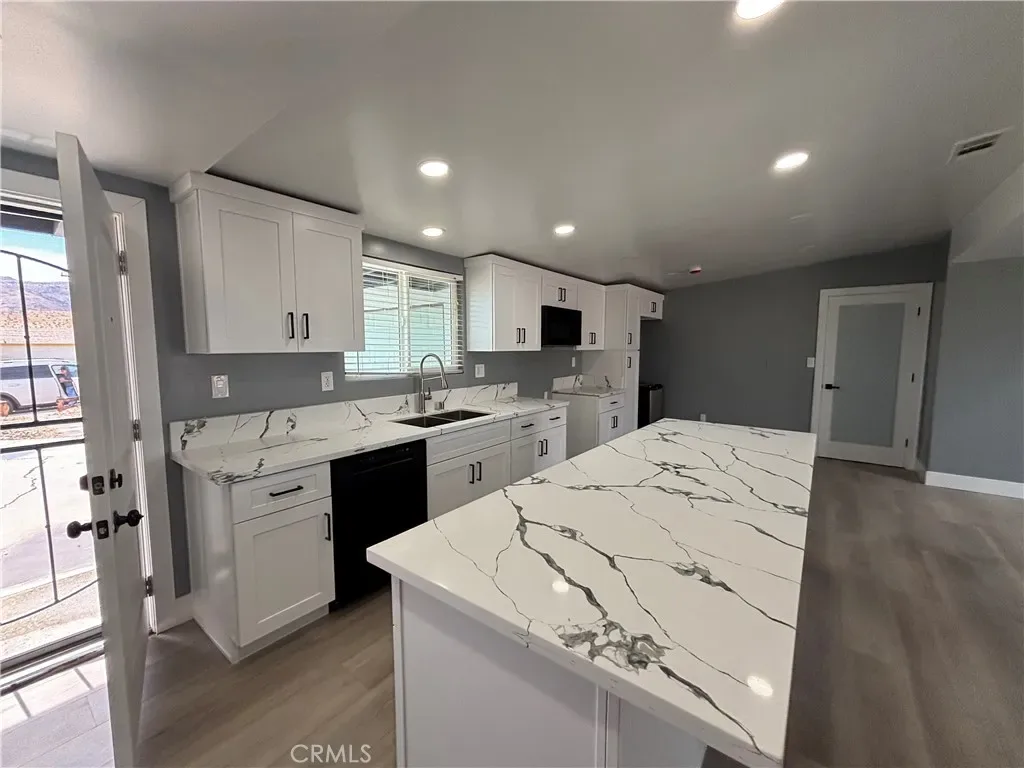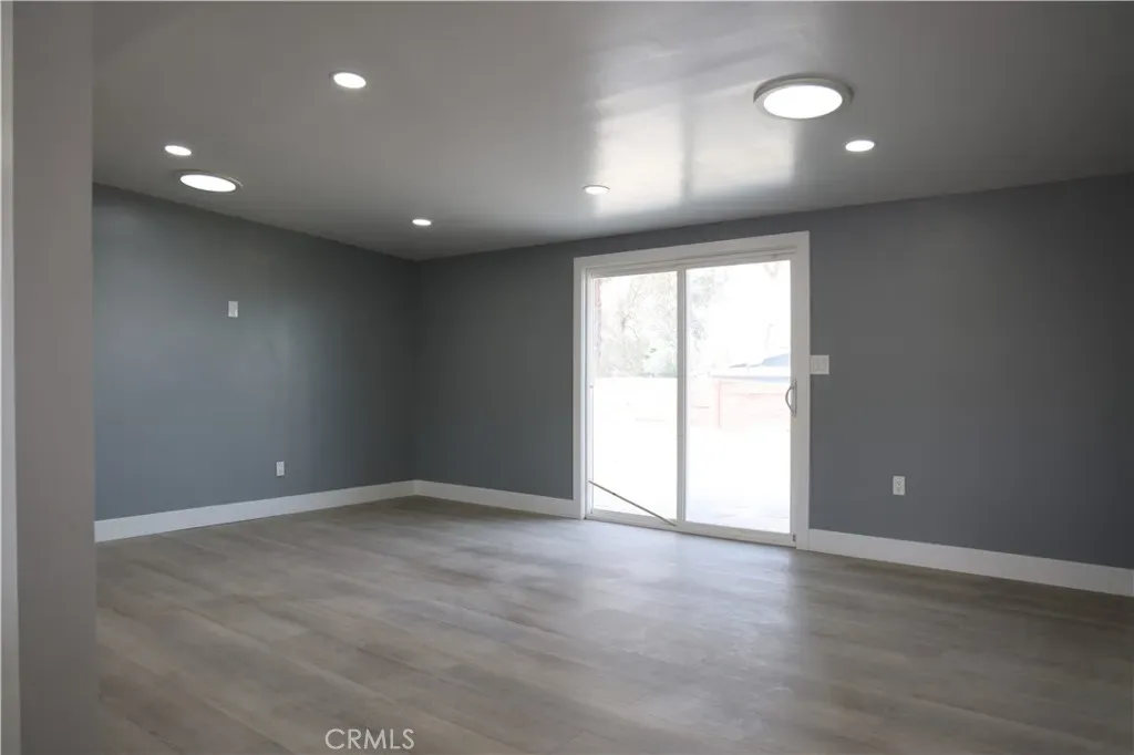 Beautifully updated 4-bedroom, 2.5-bath home featuring a spacious open floor plan. The upgraded kitchen includes a center island, newer cabinets, and flows seamlessly into the living areas—perfect for entertaining. This property offers a 2-car garage with direct access to a bedroom with a remodeled bathroom—ideal for guests or multi-generational living. Additional upgrades include newer laminate flooring throughout, interior and exterior paint, recessed lighting, dual-pane windows, and a newer central A/C unit. The living room features a sliding glass door that leads to the backyard, creating great indoor-outdoor flow. Laundry area is located in the garage. Extra-large driveway provides extra parking.