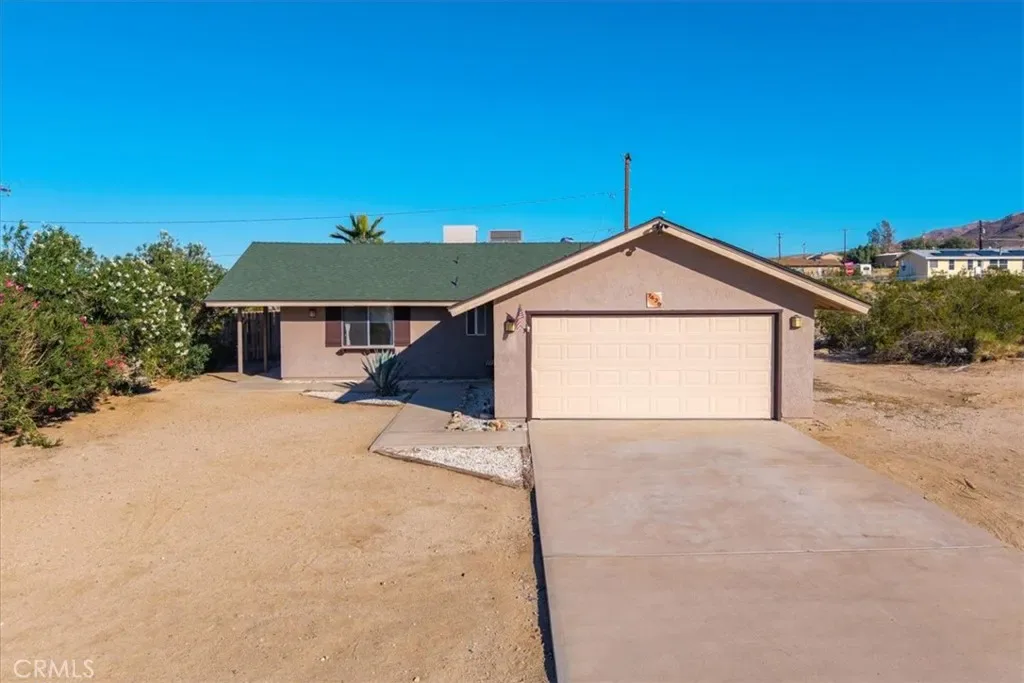 **MOTIVATED SELLER / LOW ASSUMABLE VA INTEREST RATE!** Welcome to 7429 Maude Adams Ave, a beautifully maintained 3 bedroom 2 bath home located in the quiet and desirable Hanson Track neighborhood of 29 Palms (just MINUTES from the Joshua Tree National Park East Entrance)! With close proximity to downtown, schools, eateries, the Tortoise Rock Casino, Marine Corps Base and more, you’ll love the convenience and ease this home’s prime location offers. As you step inside you’ll notice the lovely open-concept living space complete with earth-toned tile flooring, recessed lighting and large east facing windows that let in an abundance of natural light. The chefs-kitchen is anchored with an oversized island with tile countertops, amble cabinet & counter space, custom cabinetry and stainless steel appliances. This home’s neutral color palette makes it extremely versatile for any decor and style. Directly adjacent to the kitchen you’ll find the formal dining area, additional cabinetry and the access door that leads to the backyard and pool area. The primary bedroom adorns carpeted flooring, a ceiling fan and a sliding glass door for private patio access while the ensuite bathroom includes a single sink vanity with generous counter space & a pocket door that separates the lavatory & walk-in shower. The two additional bedrooms also include neutral carpeting, ceiling fans and share the aesthetically pleasing hall bathroom – complete with a single sink vanity and a shower/tub combo. Not to mention, this home has dual cooling (AC & Swamp), an attached 2 car garage and leased solar panels to keep cost low year round (buyer to assume lease). Outside you’ll be delighted to find a fully fenced yard with wood privacy fencing, a large covered patio, an above-ground pool and plenty of space to entertain or relax around a fire-pit on a starry desert night. Come take a look & let this home’s charming allure do the rest, your new desert home, investment property or weekend retreat awaits!