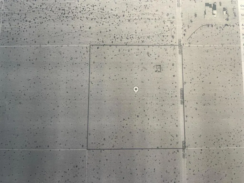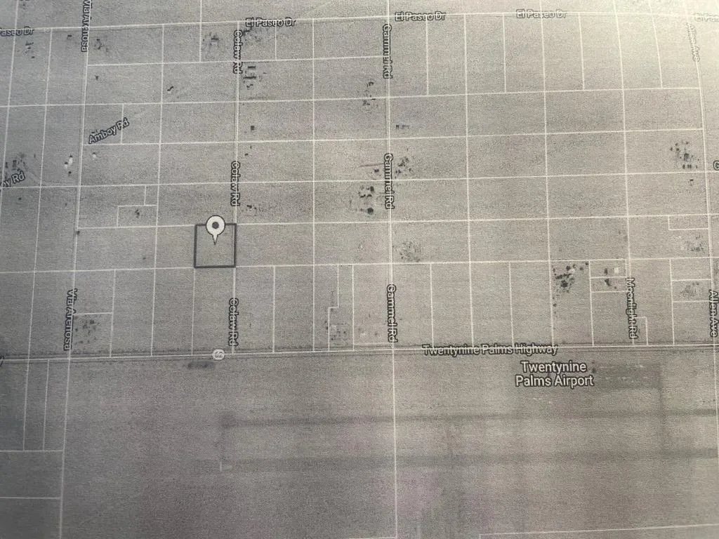 2.5 Acre square lot 330 by 330 feetNear the 29 Palms Airport outside 29 Palms city boundary in San Bernardino County about 650 feet north of Hwy 62 on west side of Colaw Rdhad recreational cabin but only has cabin concrete pad nowOWC Owner Carry possible 20 percent down 8 percent interestPower poles run along Colaw Rdpole about 50 feet north of lot line no municipal water at lot per our investigationE 1/2 S 1/2 NE 1/4 SW 1/4 SE 1/4 SEC 29 TP 1N R 10E 2.5 AC EX MIN RTS AS RESERVED BY USA