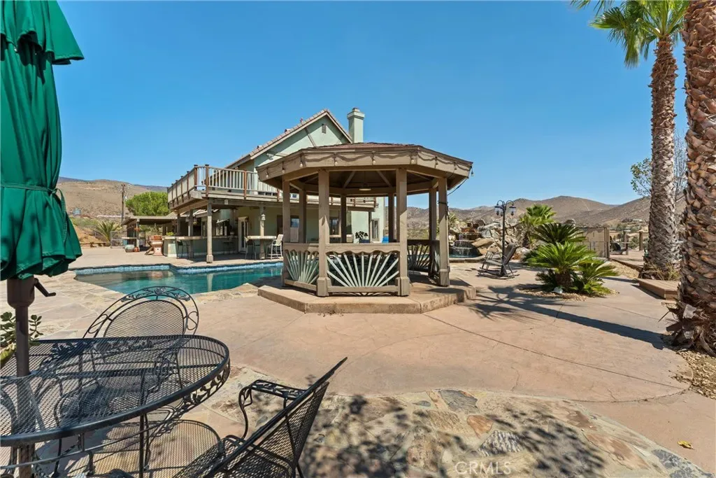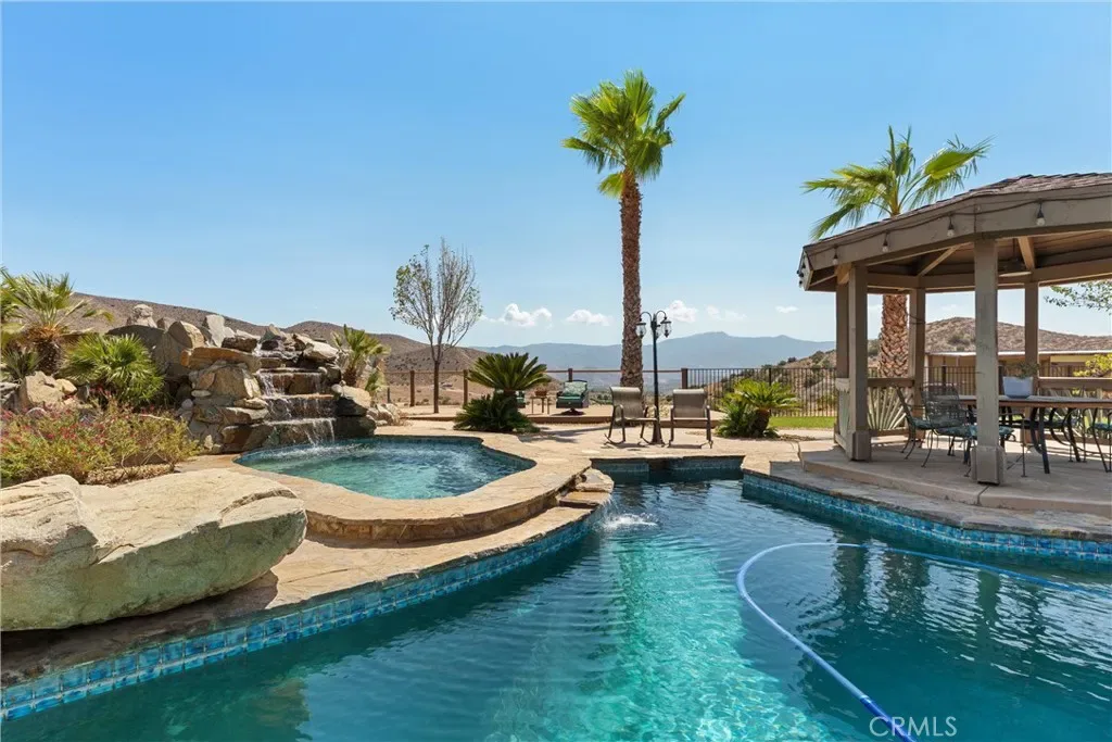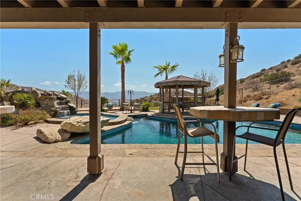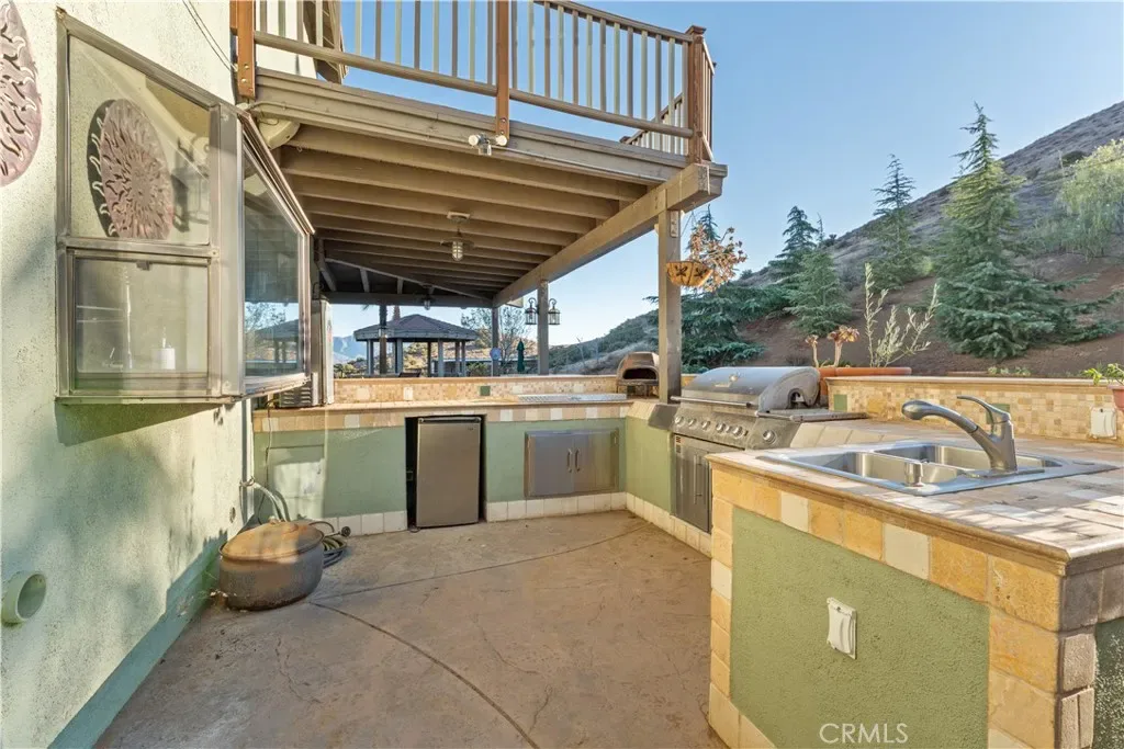 Over 5 acres of private grounds with 365 degree sweeping views of the golden California foothills. Safe and secluded, this elegant property can be your forever home, a private party location, or your equestrian estate. Located in upscale Acton, the elevated hillside terrain affords panoramic views with soft morning sunrises and stunning red sunsets. The 3194 s/f home features large picture widows and, during the day, sunbathed light in every room. With no streetlights nearby, you’ll see the night sky filled with millions of stars and hear nothing but the peaceful quiet. Enjoy these breathtaking views with morning coffee or afternoon cocktails on the (12×60) deck overlooking Acton, or on the second-story wrap-around balcony! The professionally landscaped yard includes lush desert scape, mature pine trees, massive boulders, and a rock waterfall built into the hillside. These encircle a huge, finished outdoor area with heated pool, spa (seats 14 comfortable), custom built-in barbecue, and six built-in high-top tables for that elegant wedding reception, family reunion, or holiday event. The outdoor sound system and cozy fire pit will bring a warm ambience to the chilly evenings. The elegant cobblestone driveway welcomes you to the home’s expansive front door and cozy wood beam and brick façade. Inside are formal and family living areas, five spacious bedrooms, four baths (large bed and full bath downstairs for guests), each of which include windows or doors that open to the magnificent views and office leads to the stunning wrap-around balcony. The newly renovated master ensuite boasts a gorgeous stand alone tub, walk in shower with floor to ceiling marbled tile. Need more space? There is a huge walk-in attic (29Lx15W) A 30×60 workshop with bathroom inside; also a 200 amp panel with 50/30 amp RV hook ups. Have horses? There’s room for them too! 8×24 chicken coop and 20xx24 chicken run. Tesla solar system and back up battery. Private well 6k gal. tank and MUCH MORE!