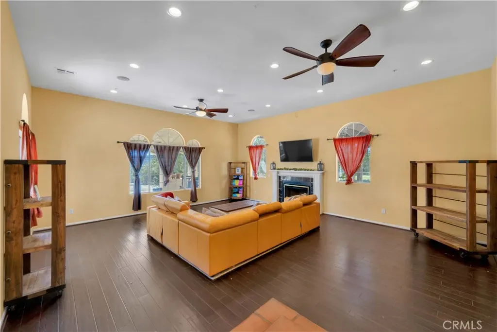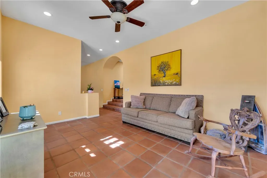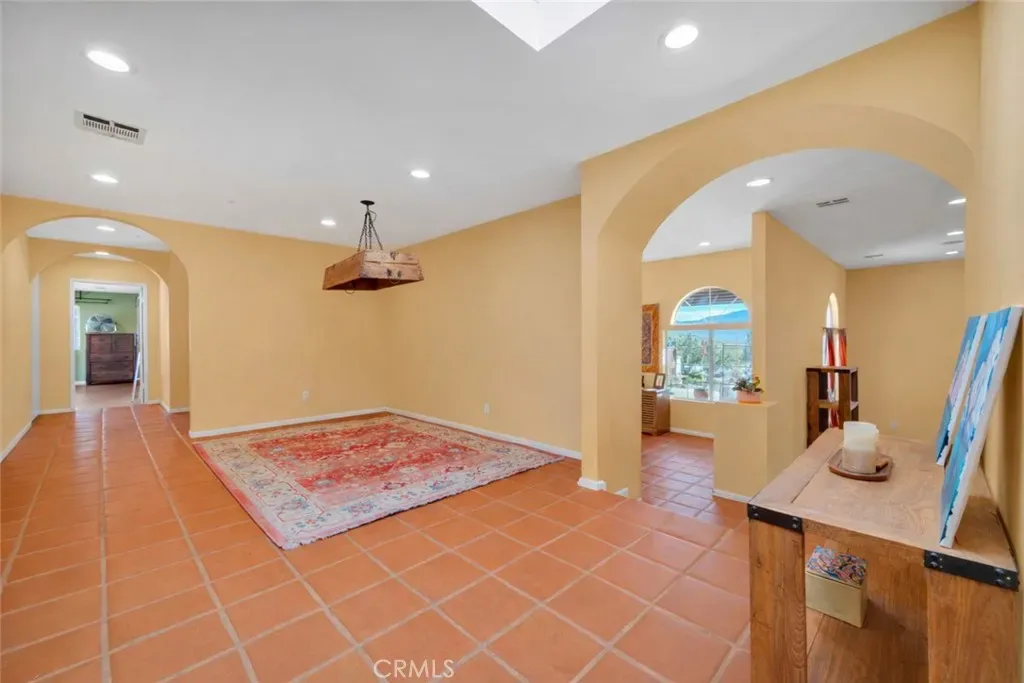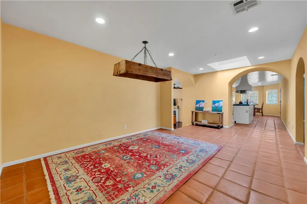 Inside, the home welcomes you with a large living area featuring rich wood flooring, abundant natural light, and a cozy fireplace that anchors the room. Multiple arched windows frame views of the surrounding landscape while creating a bright and inviting atmosphere ideal for relaxing or gathering with family and friends. The kitchen offers generous cabinet storage, white cabinetry, tiled countertops, and an oversized center island with cooktop and custom hood. Terra-cotta style tile flooring and open flow into the adjacent areas make this space both functional and warm for everyday cooking or entertaining. The primary suite provides a spacious private retreat with plenty of room for a sitting area and direct access to a beautifully designed ensuite bathroom. Additional bedrooms are comfortably sized with ample closet space and share well-appointed bathrooms.