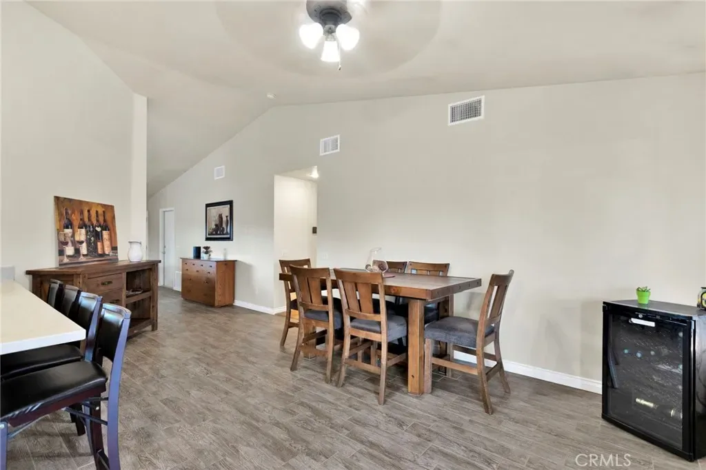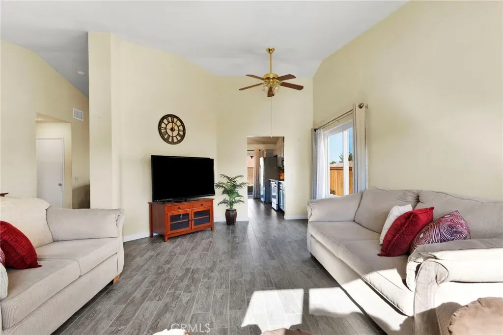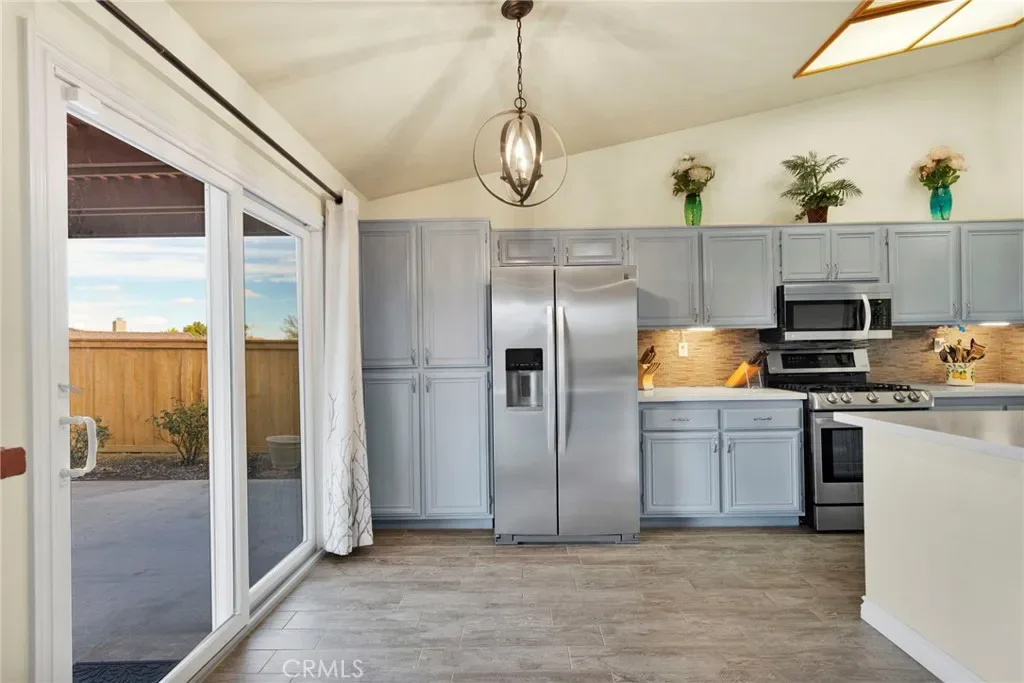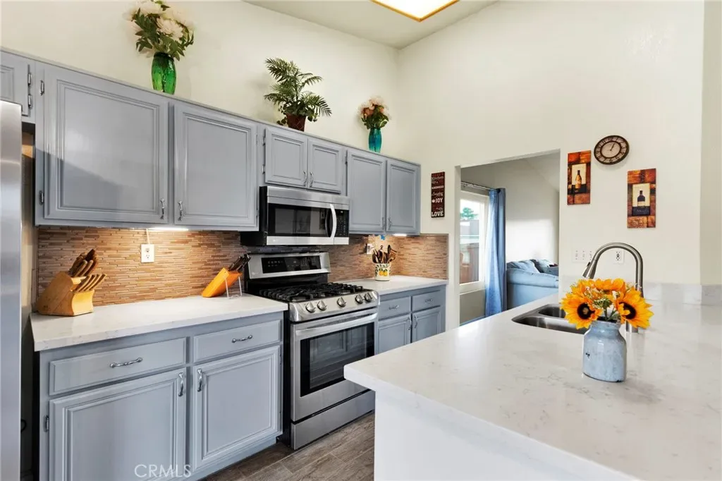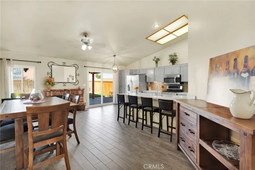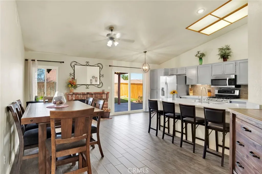 The layout includes four bedrooms, two baths, and approximately 1,671 square feet of well-designed living space, along with a three-car garage. The kitchen features quartz countertops, a breakfast bar, updated cabinets, and appliances that include the refrigerator. Vaulted ceilings and large picture windows bring in natural light and create an open feel. A formal living room is complemented by an open family room, dining area, and kitchen, making the space comfortable for everyday living and gatherings.