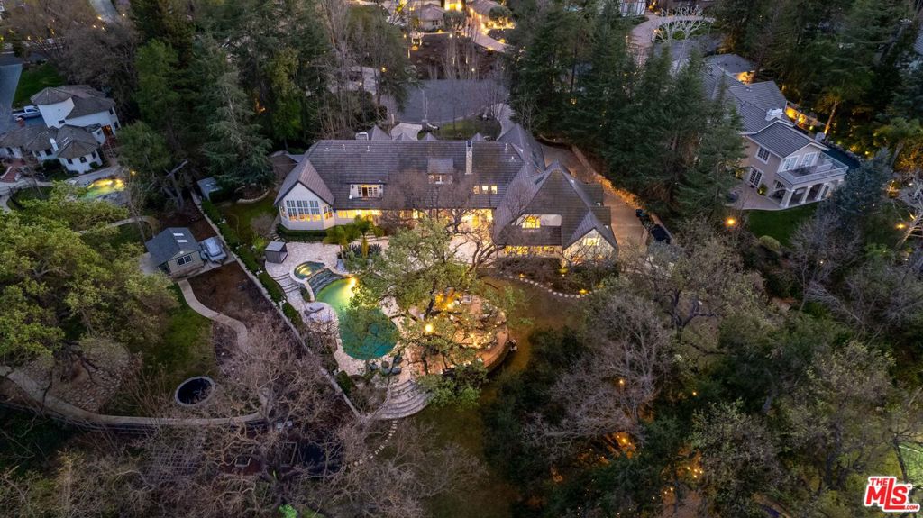 Set behind the exclusive gated community of Medea Valley Estates, 29105 Old Mill Creek is one of those properties that rarely comes along. Set at the end of a quiet cul-de-sac on over 1.8 usable acres, this 11,000+ square foot estate offers privacy, scale, and a creative edge that makes it feel truly custom.The design embraces volume and light, with massive windows, French doors, and skylights bringing in natural light throughout. A formal entry sets the tone and leads into a striking living room centered around warming fireplace and wall of French windows framing views of the parklike backyard and pool, creating a seamless connection to the outdoors. The formal dining room is built to host. Generous in size with elegant proportions, it easily accommodates large gatherings while still feeling intimate for smaller dinners. Positioned to flow naturally from the main living areas and kitchen, it’s a space that works just as well for holidays and celebrations as it does for everyday meals. The chef’s delight kitchen is outfitted with top-tier professional appliances, custom cabinetry, marble countertops, and an expansive butler’s pantry. The chef’s kitchen opens to a sunlit great room boasting a breakfast area and adjoining game room. A standout custom office adds personality, complete with a professional bar, floor-to-ceiling brick fireplace, and a built-in seating area ideal for meetings or evenings with friends. For elevated entertainment, the home features a professional media room designed for a true cinematic experience. Tiered seating ensures every seat has a perfect view, while French doors allow the space to open for larger gatherings or remain closed for an immersive movie night. The main-level primary suite is both dramatic and serene, with soaring ceilings, fully customized designer closets, and a spa-caliber bath featuring a multi-head steam shower,separate soaking tub and dual water closets. The backyard is where the property truly separates itself. Expansive lawns, mature Oaks, and multiple entertaining areas surround a sparkling pool and spa. A lighted sports court offers space for year-round recreation, while the natural creek running along the back of the property adds privacy and a peaceful, scenic backdrop. It feels like your own private park usable, secluded, and hard to replicate. A must see, you won’t be disappointed.