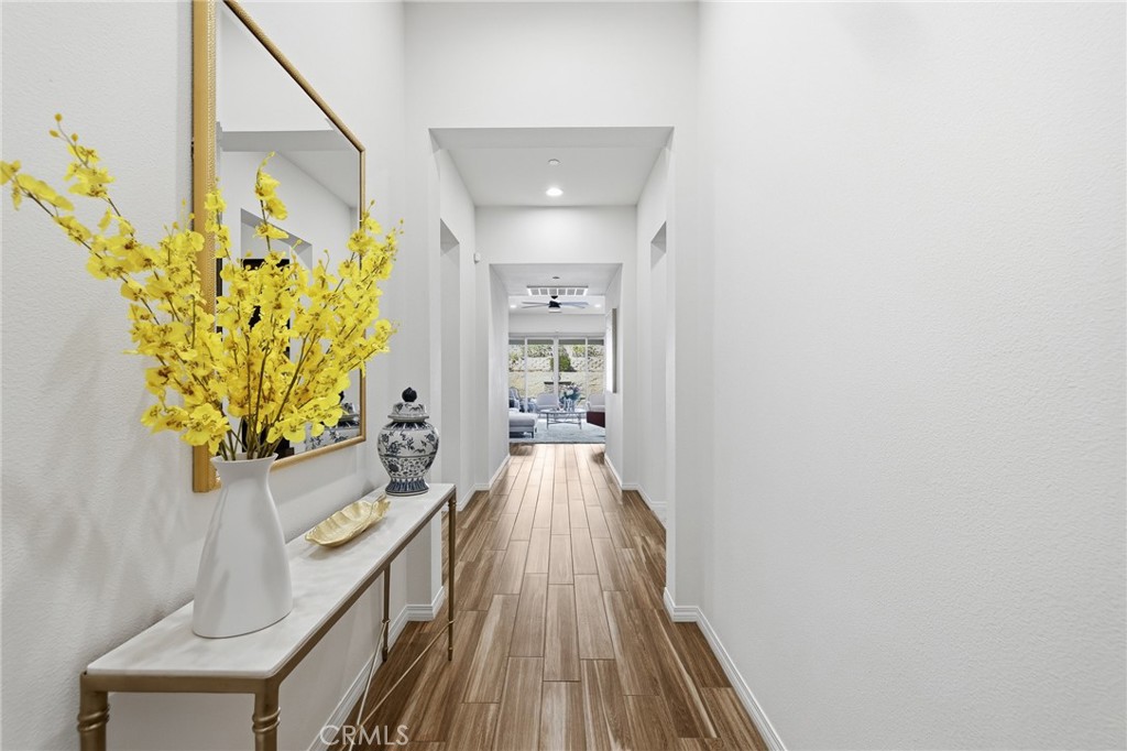 Enter through a welcoming foyer into a light-filled open layout designed for seamless indoor-outdoor living. Lofty vaulted ceilings and gleaming wood-look porcelain floors create an airy feel throughout. Oversized sliding glass doors frame lush surroundings while custom plantation shutters add a refined touch.