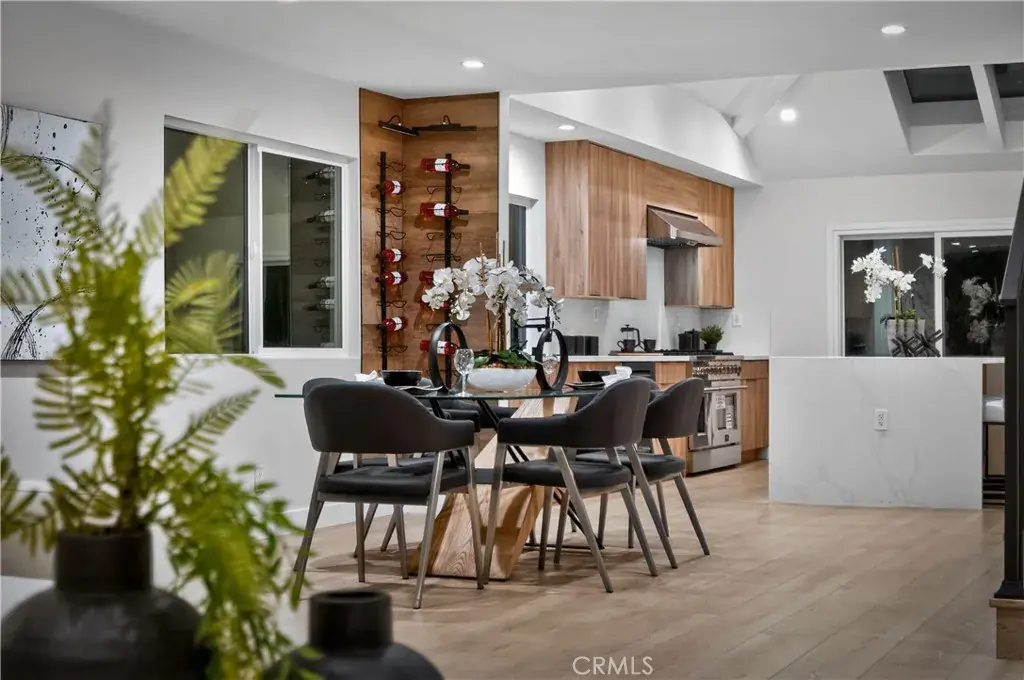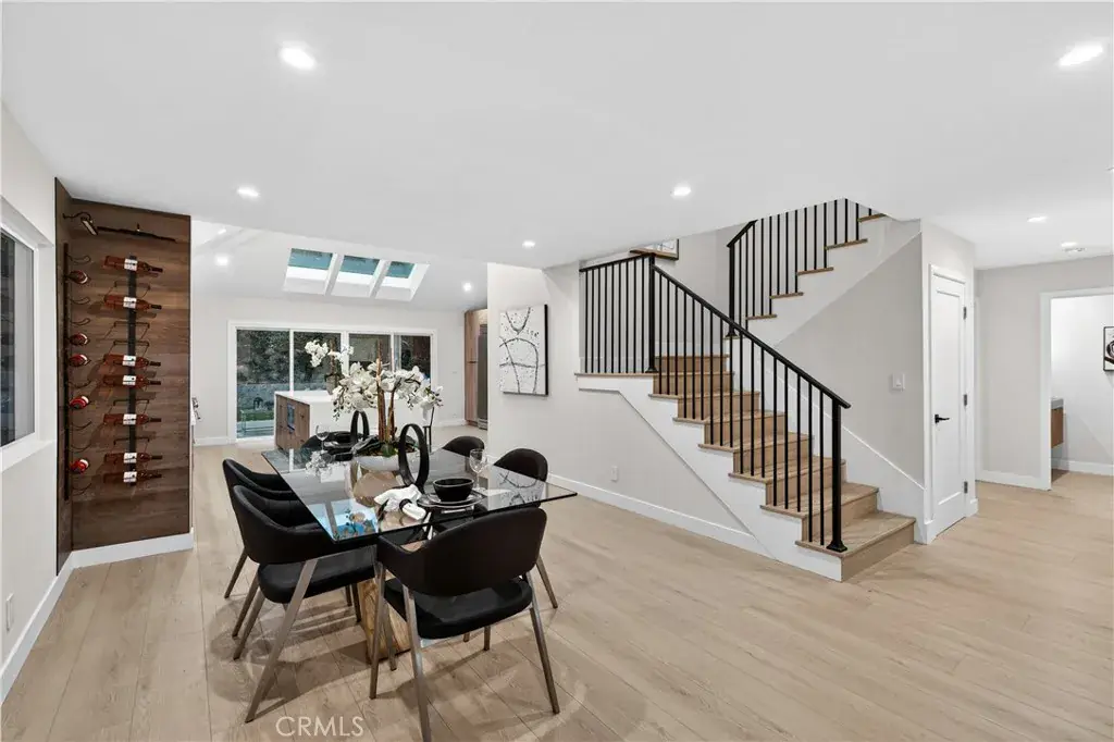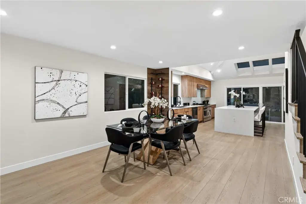 The state-of-the-art kitchen, illuminated by a skylight and enhanced by impressive ceiling height, features premium stainless steel appliances, quartz countertops, custom cabinetry, and generous prep and storage space — blending style and function.