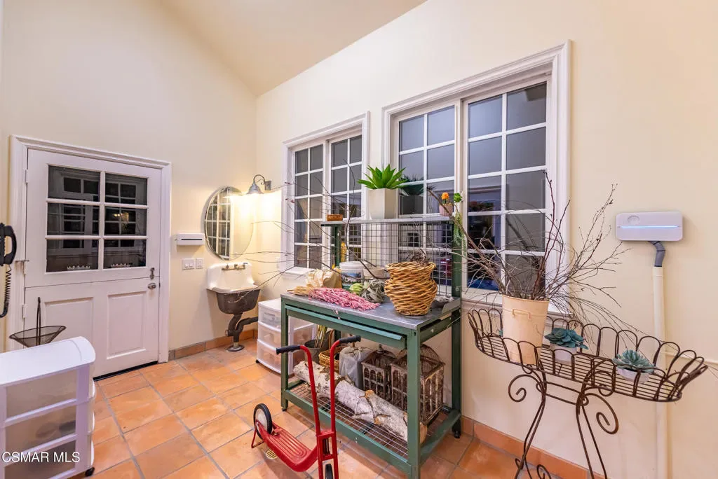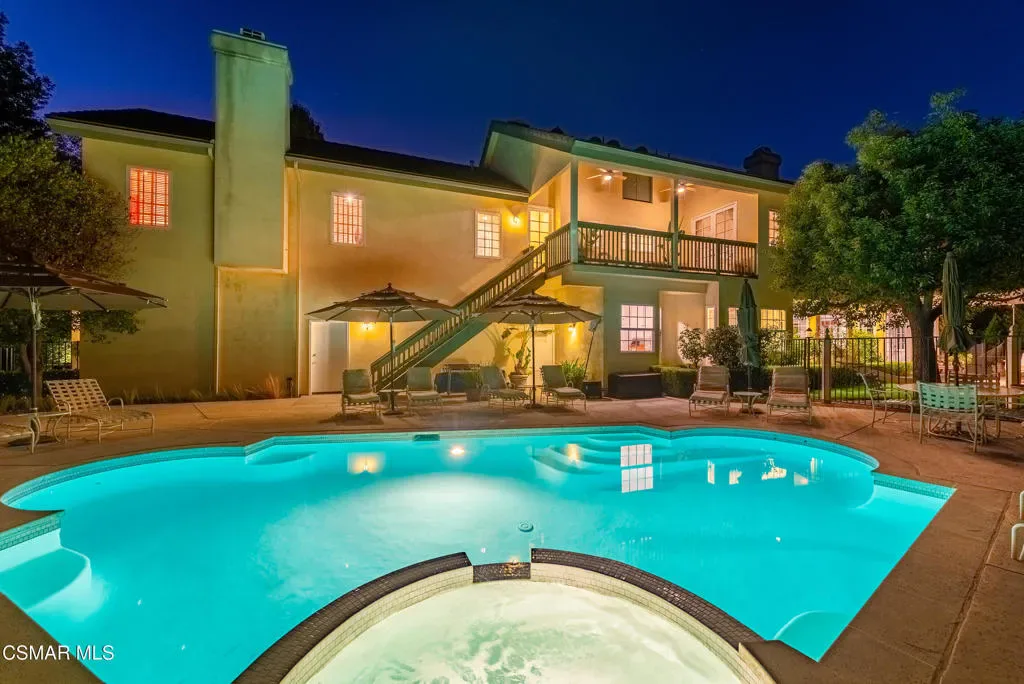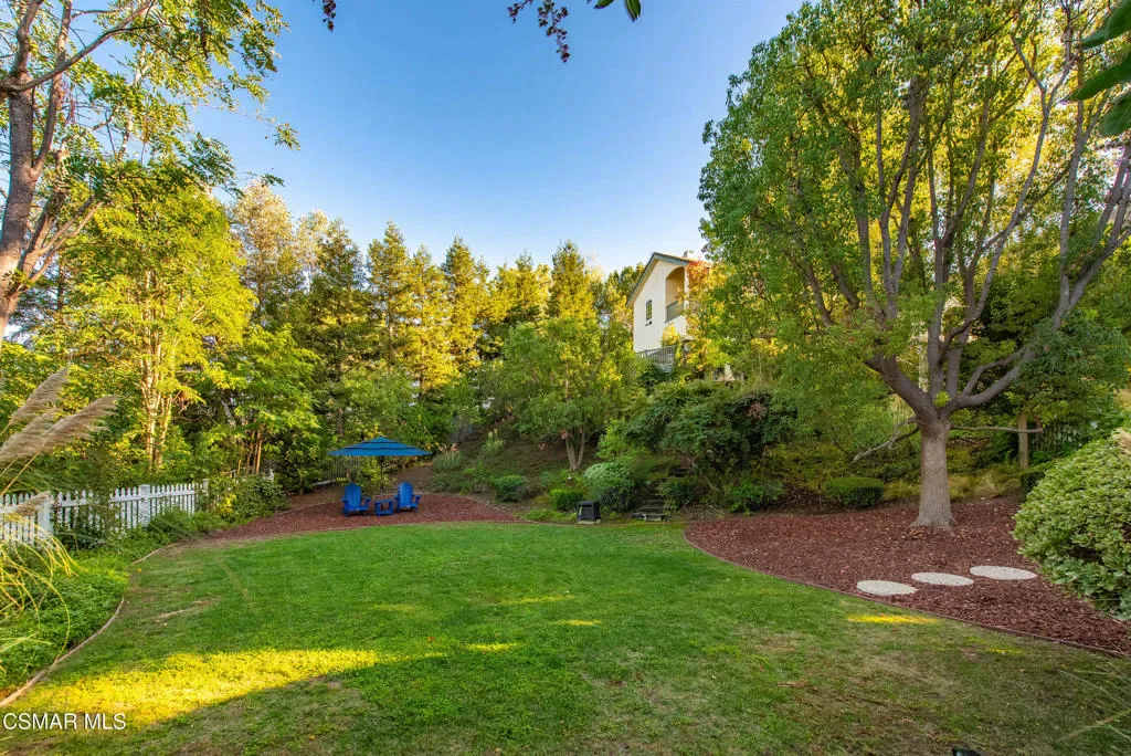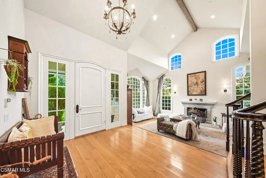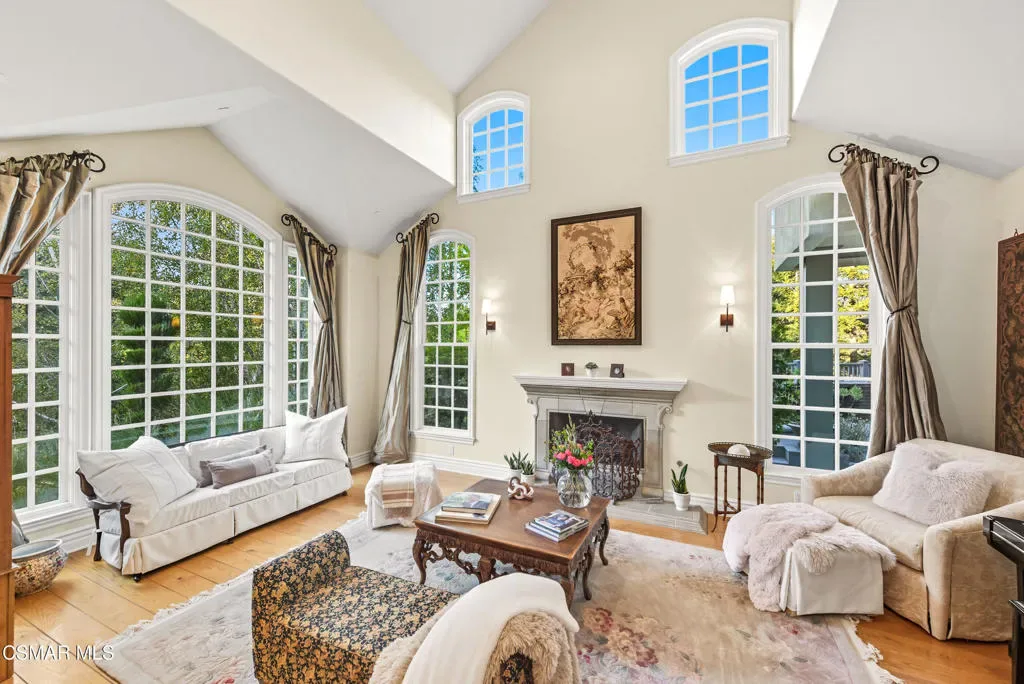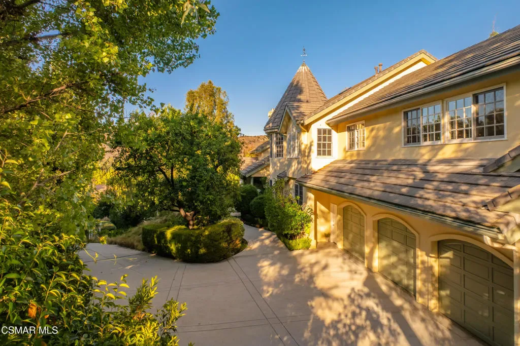 Elegant Country French Estate in Prestigious Medea Valley nestled atop a privately gated knoll. Masterfully built with the finest materials including designer tiles from famous Mission Tile Co. Sweeping mountain and valley views are the backdrop to classic elegance with modern amenities. The community security gate ensures exceptional privacy and a peaceful retreat. Upon entry, you’re greeted by soaring ceilings and expansive windows in the Formal Living Room, while the spacious Dining Room features a graceful bay window ideal for entertaining. The heart of the home is the open-concept Family Room, Kitchen, and Breakfast Nook. The gourmet Kitchen includes a prep island, Viking appliances, walk-in pantry, white cabinetry, and generous counter space. The sunlit Family Room offers a built-in entertainment center, fireplace, and French doors leading to a charming patio with built-in BBQ. A downstairs Bedroom with custom office cabinetry provides a flexible workspace and a private bath. Upstairs, the luxurious Main Suite features a fireplace, sitting room with private veranda, dreamy walk-in closet, and a spa-like bath with soaking tub. French doors open to a large balcony that overlooks the pool and serene mountain vistas. Completing the upstairs are 3 additional bedrooms and two well-appointed baths plus an amazing 500 sq ft Bonus Room with fireplace and private exterior entry. The beautifully landscaped grounds include a private orchard with apple, peach, plum, and lemon trees, a pool and spa, expansive deck with beautiful views and a park-like playground. Recent upgrades include a new HVAC system and remodeled pool with new equipment.Additional highlights: Oversized three-car garage with custom cabinetry, 108 sq ft potting room/studio or storage, EV-ready with separate meter and hookup.Private community access to hiking trails in the Santa Monica Mountains Preserve and Paramount Ranch. Medea Valley Estates is just five minutes from the 101 freeway and offers convenient access to schools, fine dining, wineries, shopping, and Malibu beaches. A rare blend of privacy, luxury, and location–this custom-built estate is truly one of a kind.