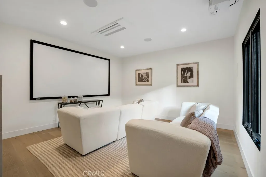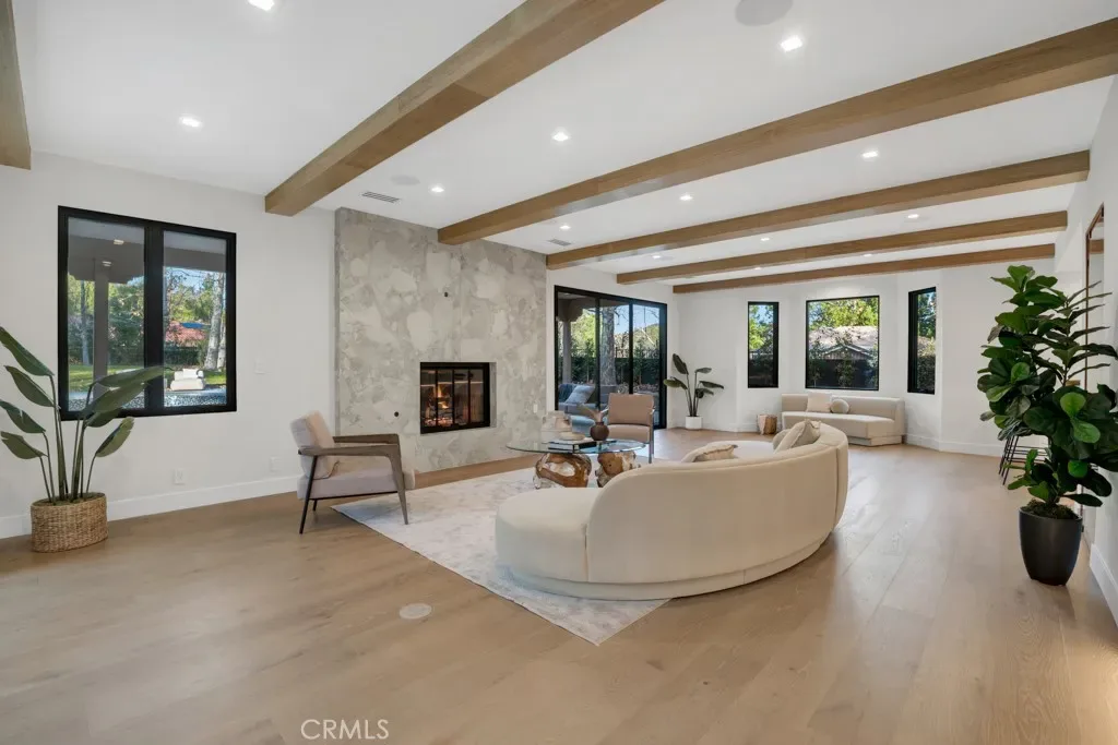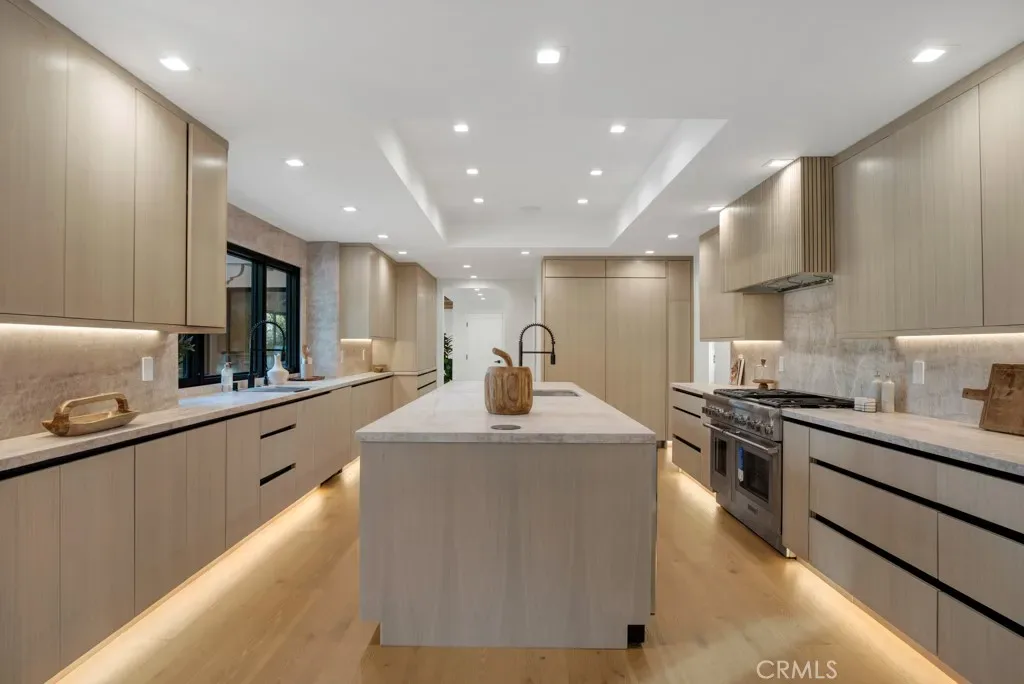 A rich formal living room features a dual-sided fireplace and opens to a screening room for intimate, cinematic evenings. Custom French oak flooring and towering ceilings create an expansive, bright ambiance throughout. The gourmet kitchen is a chef’s dream, with top-tier appliances, meticulously crafted cabinetry, and an island poised for grand gatherings.