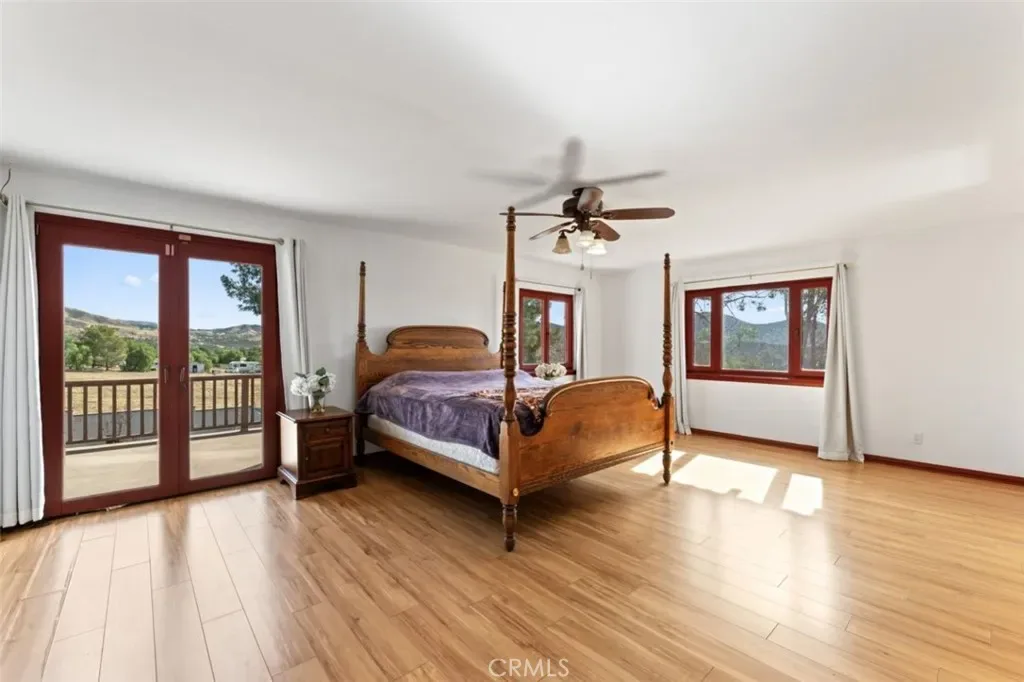 This exquisite two-story residence is situated on a flat or gently rolling 14.11 acres, encompassing two APNs: 3213-030-002 and 3213-030-029. The home boasts a generous 3,792 square feet of living space, featuring four bedrooms, two full bathrooms, and two powder rooms. Both the family room and living room are enhanced by wood-burning fireplaces. Remodeled kitchen is equipped with modern Viking appliances, including a double oven, range top, trash compactor, and a custom double sink with faucet. Custom triple-pane glass windows and doors, imported from Europe, were installed (as per the previous owner). The upper level offers balconies on three sides, providing stunning views, while the master bedroom’s expansive balcony overlooks the pool, spa, and waterfall, with a private staircase granting direct access to the pool area. The rear of the house features a large wooden deck complete with a fire pit, built-in bar, making it an ideal venue for gatherings. A four-stall barn is available, which can easily serve as a workshop. The property includes RV parking, a two-car attached garage, and extra parking under a carport. For automotive enthusiasts, there is also a concrete bay on the premises. This horse property offers direct access to horse trails from the back, and one well is located on the property, all just a short distance down a dirt road, ensuring a private and tranquil setting. Paid off solar panels with 2 Tesla batteries, pool has new energy efficient pool pump recently installed. Completely covered chicken coop and duck pond behind the barn.