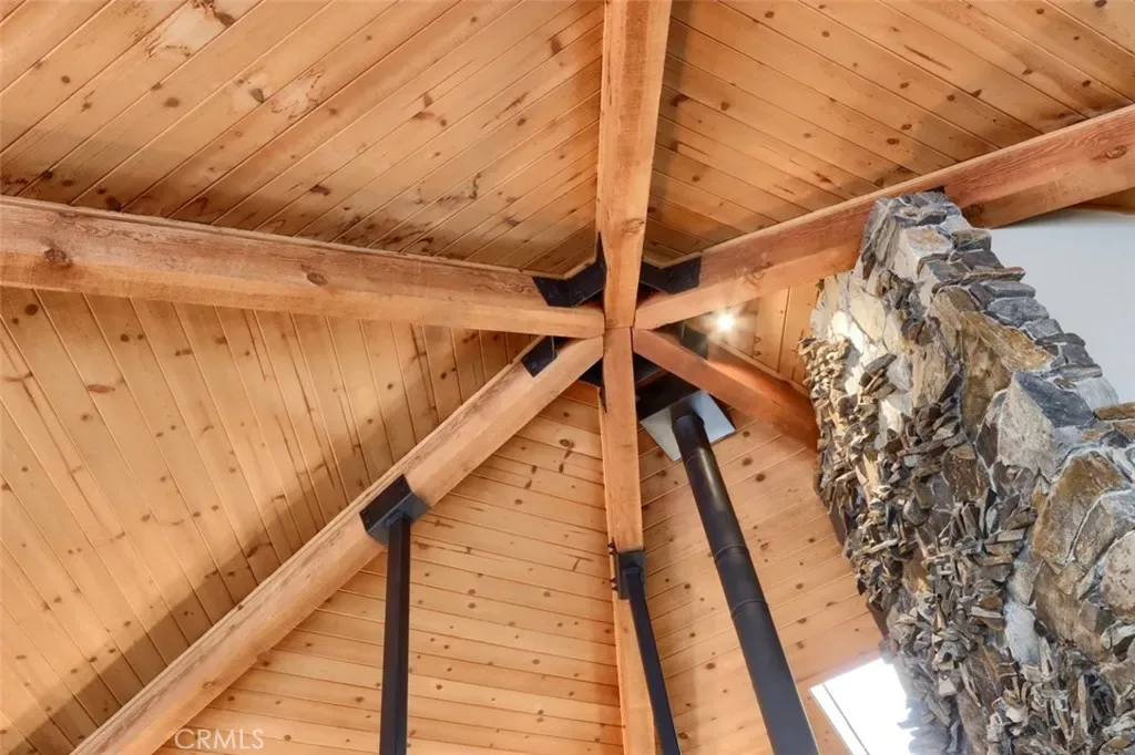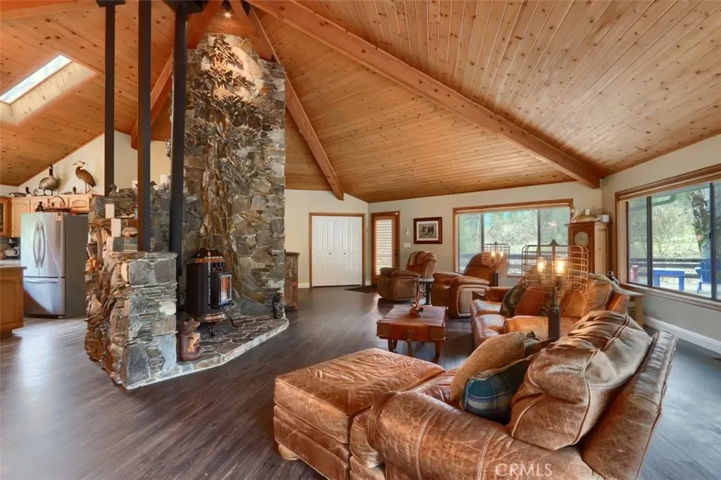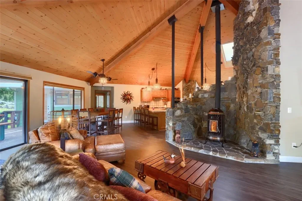 Inside, the home showcases warm, rustic elegance with tongue-and-groove beamed ceilings and a stunning custom rock hearth as a focal point. The spacious kitchen is designed for both function and gathering, featuring a large center island and counter seating area.
