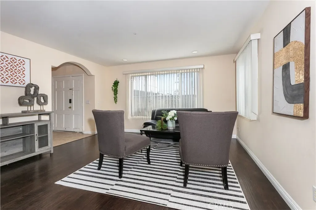 The living room features high vaulted ceilings and large windows that allow ample natural light. An arched opening connects the space to the dining room, creating an open flow ideal for casual gatherings.