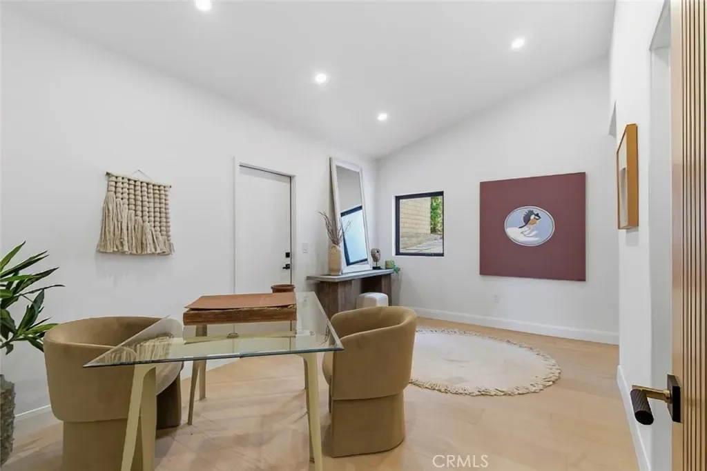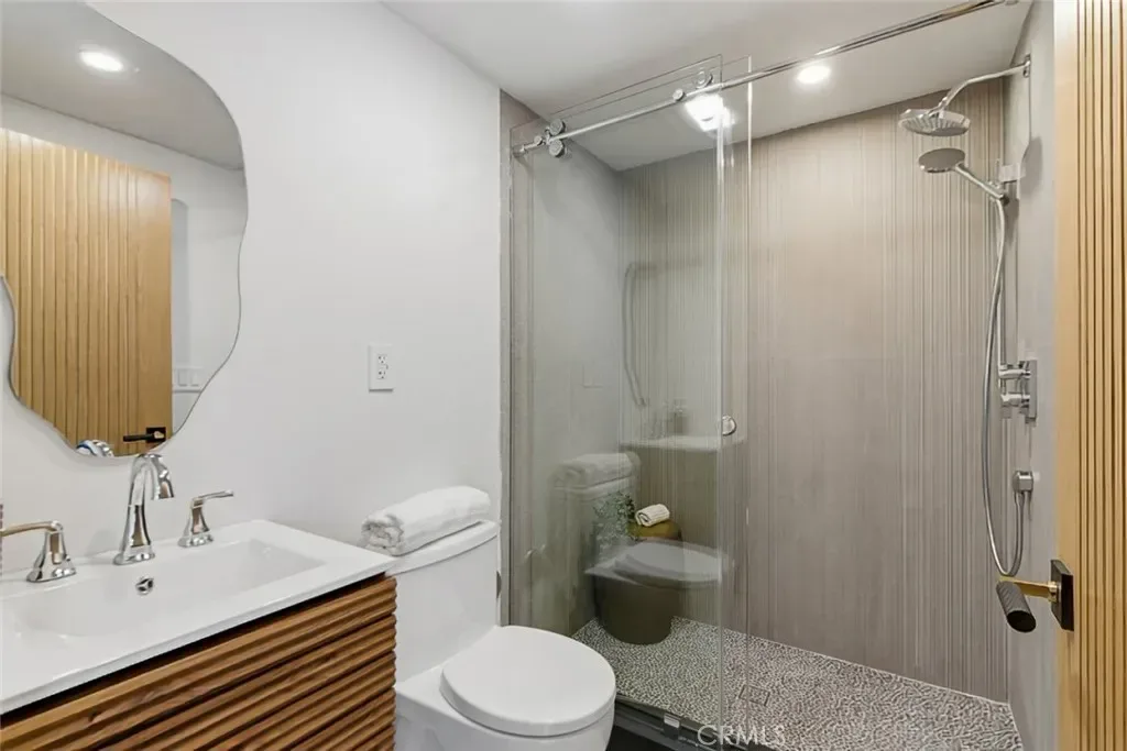 A spacious downstairs family room offers flexible use and can easily function as a fifth bedroom, guest suite, or home office. This space provides direct access to the backyard, creating effortless connectivity to the outdoor living areas.