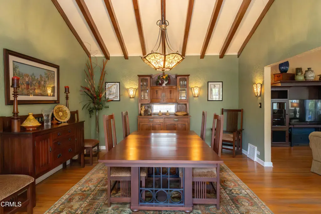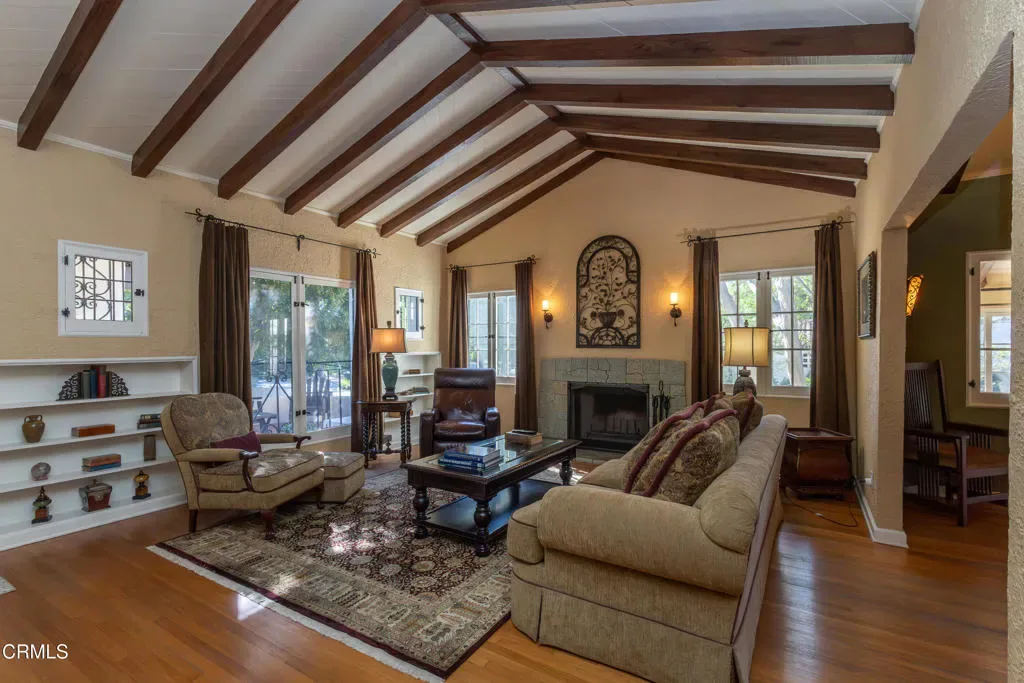 Located in beautiful Altadena, this charming, fully furnished Spanish-style home blends timeless character with inviting outdoor spaces and thoughtful updates. Exceptional curb appeal welcomes you with lush landscaping, a manicured lawn, and a spacious brick front porch and patio, perfect for relaxing under the shade of a mature tree. Inside, the home’s original character shines. A classic front door with wrought iron detailing opens to vaulted wood-beamed ceilings, rich hardwood floors, and a warm living room anchored by original built-in shelving and picture windows overlooking the front yard. Leaded glass windows and a custom-tiled fireplace with intricate detailing further highlight the home’s Spanish heritage. To the right of the entry, the first bedroom features hardwood flooring, a walk-in closet, and a lighted ceiling fan, along with access to a Jack-and-Jill bathroom complete with a tiled shower and a bench seat. This bath connects to a second bedroom or ideal office space, also offering a ceiling fan and ample closet space. The living room flows seamlessly into a formal dining area with vaulted wood-beamed ceilings, creating an inviting space for gatherings. Just beyond, a cozy sunroom or den offers the perfect spot to unwind with a book or enjoy your morning coffee. The kitchen features tile flooring, stone countertops, a charming tiled backsplash, abundant cabinetry, and a slide-in gas range with hood, along with a stainless steel dishwasher and refrigerator. A breakfast bar adds casual seating, while a dedicated laundry room with a washer, dryer, and storage cabinets provides everyday convenience. Down the hallway, accessed through a charming wrought iron gate, you’ll find the remaining bedrooms and a full bathroom with a pedestal sink and a classic clawfoot tub with a shower. The third bedroom offers hardwood flooring, crown molding, a generous closet, and direct access to a wood deck that extends toward the kitchen entrance. The backyard is a peaceful retreat with a grassy lawn, garden space, and a large mature tree providing shade, ideal for relaxing or entertaining. This beautifully maintained lease offers a rare opportunity to enjoy classic Altadena charm with modern comfort in a truly special setting.