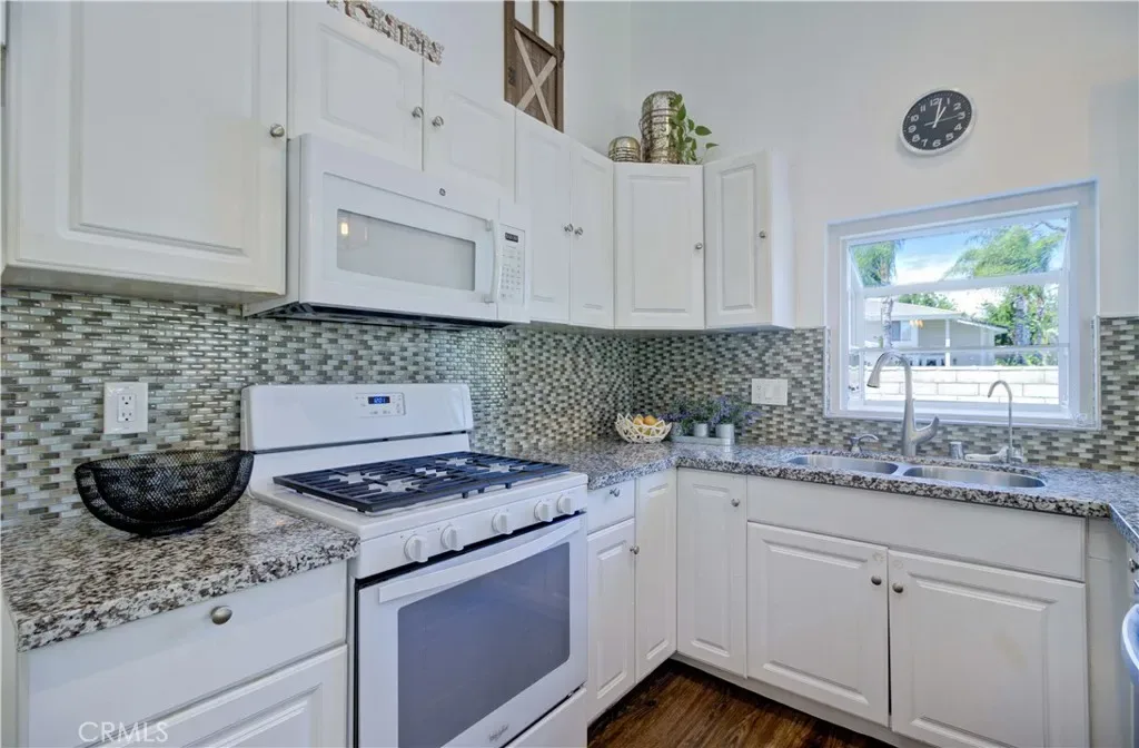 The spacious living room boasts vaulted ceilings and a cozy fireplace, creating a warm and inviting atmosphere. It seamlessly connects to the upgraded kitchen, which showcases white cabinetry, granite countertops, a stainless-steel sink, and newer appliances. The open flow continues into a versatile dining area or family room—perfect for everyday living and entertaining.