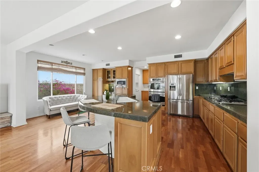 VIEW! VIEW! VIEW! Stunning canyon and city views from this beautifully upgraded executive home perched high in the Summit Springs community of Anaheim Hills. This exceptional residence features a fantastic floor plan with a spacious formal living room showcasing rich wood flooring and elegant custom touches throughout. The open-concept family room flows seamlessly into the gourmet kitchen, complete with granite countertops, stainless steel appliances, a large center island, and an additional dining area—perfect for entertaining. The home offers hardwood flooring throughout the downstairs and soft, neutral carpeting upstairs. One upstairs bedroom has been thoughtfully converted into a versatile bonus room with a study area. A convenient downstairs bedroom is ideal for guests or multi-generational living. The primary suite boasts breathtaking panoramic views of the city and surrounding hills. Step outside to a beautifully designed backyard with extensive hardscaping and a built-in barbecue—perfect for enjoying Southern California living. Pride of ownership shines throughout this well-maintained home. Located near award-winning schools and close to shopping, dining, and amenities. Don’t miss this incredible opportunity!