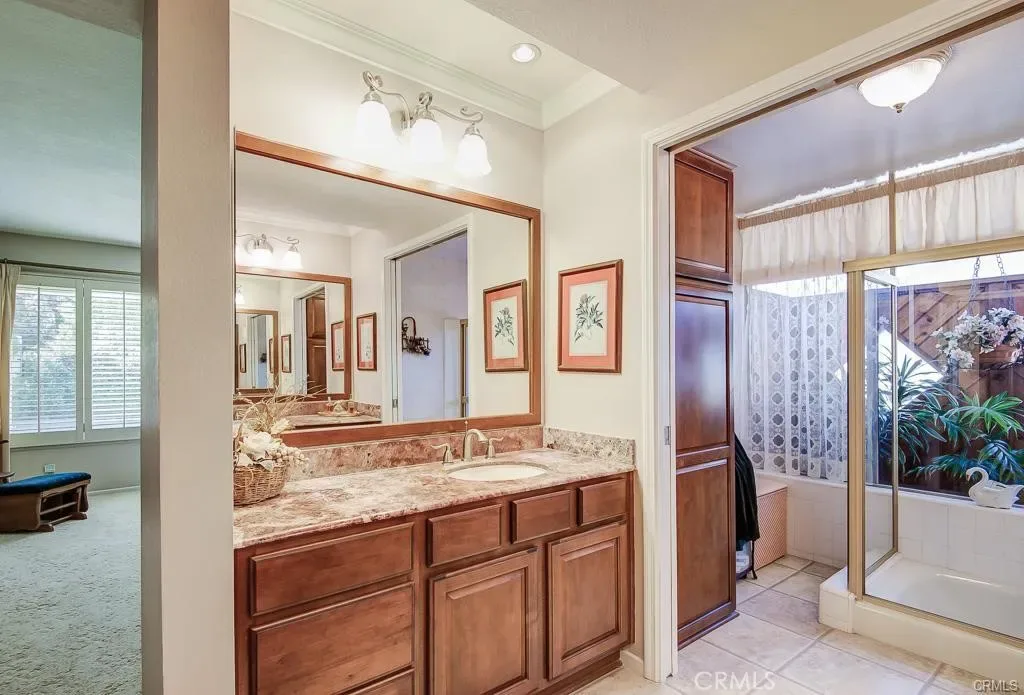 Beautiful single level home in picturesque Westridge HOA of Anaheim Hills. Amazing front yard is highlighted by the brick steps accented by lovely planters. Charming & private gated courtyard is perfect for you to sit out & enjoy your morning coffee. Double oak door w. stained glass opens to a large entry hall w. oak wood floor & living room w. vaulted ceilings. The Hallway bath features granite countertop, newer cabinetry, frameless shower door, tile flooring, nicely patterned tiled walls to the ceiling w. 2 soap boxes, handicap bath grab bars plus wheelchair friendly vanity & shower entry. Remodeled master bath boasts double vanities w. new countertop, new cabinets, light fixtures, mirrors, recess lights, & refinished bathtub. Kitchen is upgraded w/granite countertop and refinished cabinets. Top of line dual pane windows & 2 glass sliders-Many w. expensive V-groove glass & wood shutters! Approx. 8784 SF lot offers Lush landscaping, cheerful blossoms, & mature foliage. Roofline covered patio in rear. Retractable awning controlled by a switch in side yard. Scrapped ceilings & NEW interior paint. Newer wood like tiles in family room & marble like tiles in kitchen & around fireplace, newer wood floor in secondary bedrooms. Walk-in closet in master. Ceiling fans. Epoxy floor & painted cabinets in garage. Large shed for extra storage. HOA pool & tennis courts! Just professionally cleaned! Ready for move-in!