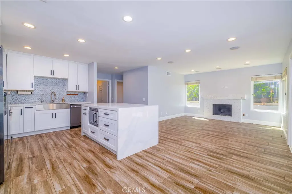 Step inside to soaring ceilings, abundant natural light, and an open-concept floor plan that flows seamlessly from the living and dining areas into a fully remodeled kitchen featuring white shaker cabinetry, quartz countertops, stainless steel appliances, and a large center island perfect for both everyday living and entertaining.