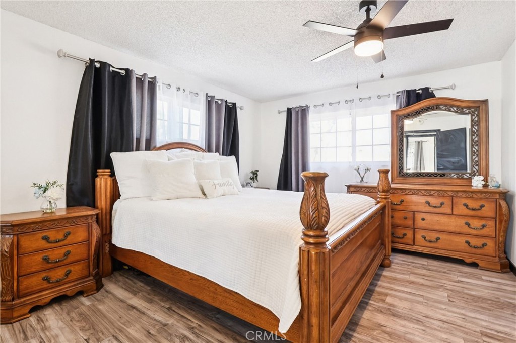 Sliding doors from the dining room lead to a backyard oasis that is sure to impress. The covered patio is an entertainer’s delight, overlooking the pristine saltwater pool with its enchanting waterfall and relaxing Baja shelf. Beyond the pool lies an oversized, custom Gazebo Room/Outdoor Kitchen, complete with double refrigerators, stove-top cooking, a built-in barbecue, and plentiful counter space for hosting unforgettable parties. The home’s backyard is further enhanced by a several citrus & fruit trees. Each bedroom offers a tranquil retreat, complete with ceiling fans and solid wood doors. The hallway bathroom has been updated beautifully. The Primary Bedroom has its own en suite bathroom that also has been updated.