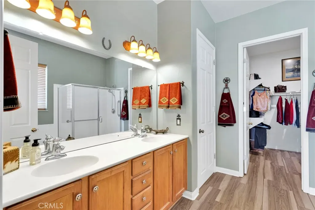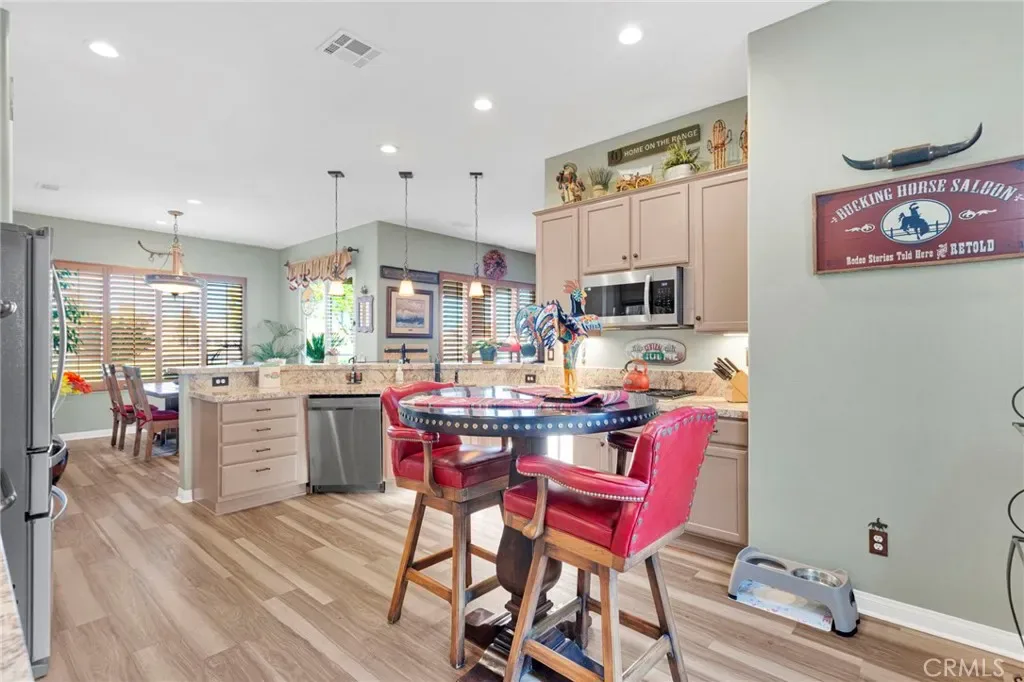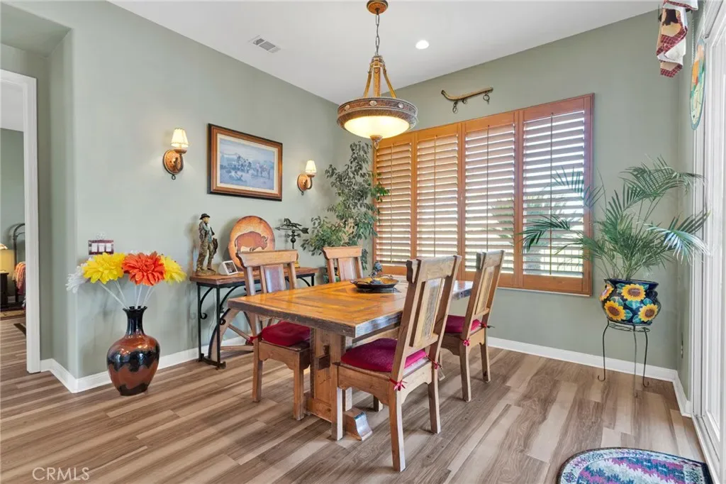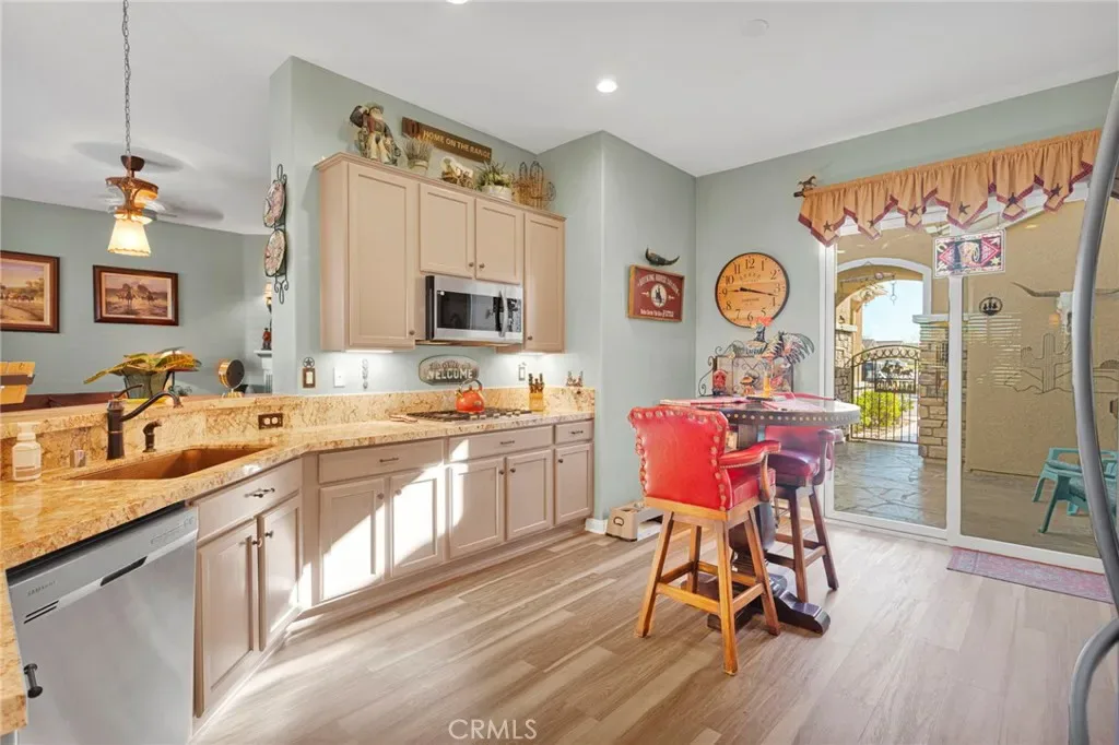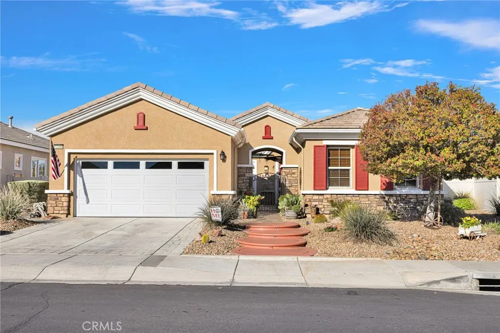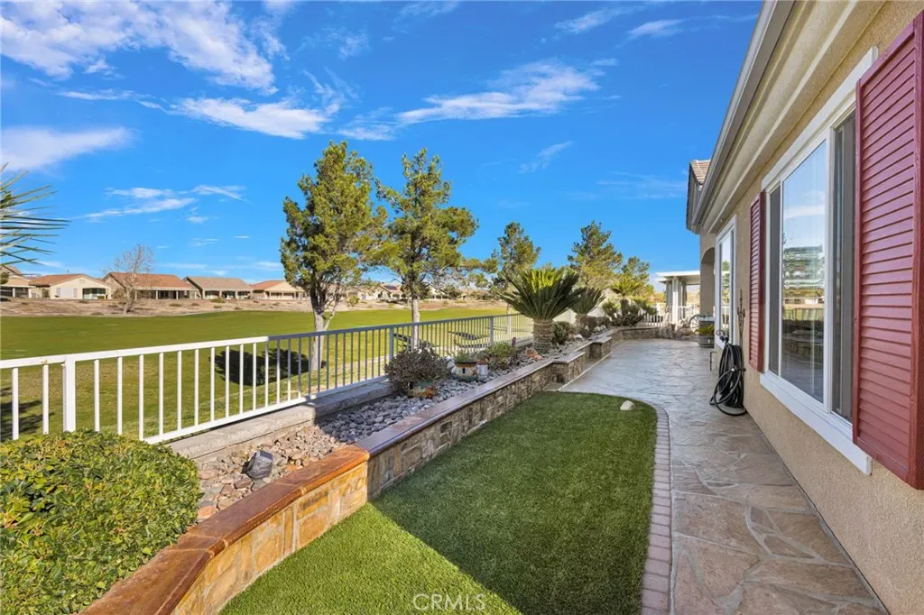 Welcome home to this stunning Magnolia model located on the golf course in the highly sought-after 55+ community of Sun City by Del Webb in Apple Valley. Enjoy breathtaking views of the fairway and surrounding mountains from this beautifully upgraded home filled with character and country charm. Inside, you’ll find wood flooring throughout, offering both durability and easy maintenance. The kitchen is the heart of the home, and features upgraded granite countertops, a custom copper sink with a modern faucet, stainless steel appliances, unique pendant lighting, and wood-toned plantation shutters(throughout). The open layout makes it perfect for everyday living and entertaining. This split floor plan offers privacy and functionality. The oversized primary suite enjoys golf-course views and includes a spacious ensuite bathroom with a dual-sink vanity, soaking tub, walk-in shower, private water closet, and large walk-in closet. On the opposite side of the home, you’ll find a flex room/den that can easily serve as an office, craft room, or potential third bedroom, along with a spacious secondary bedroom with a walk-in closet.