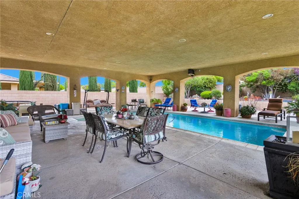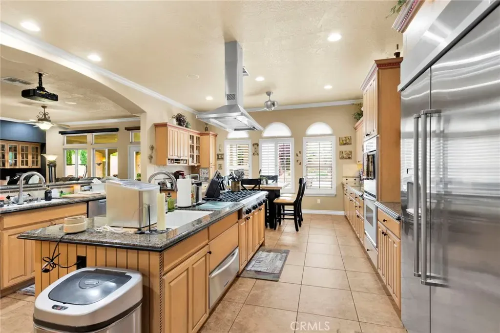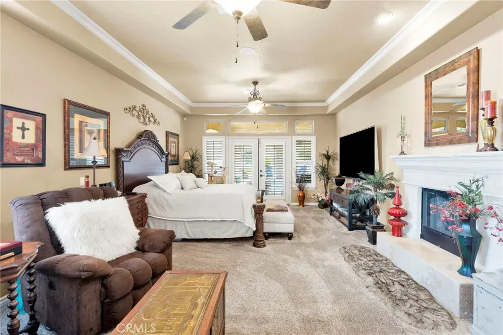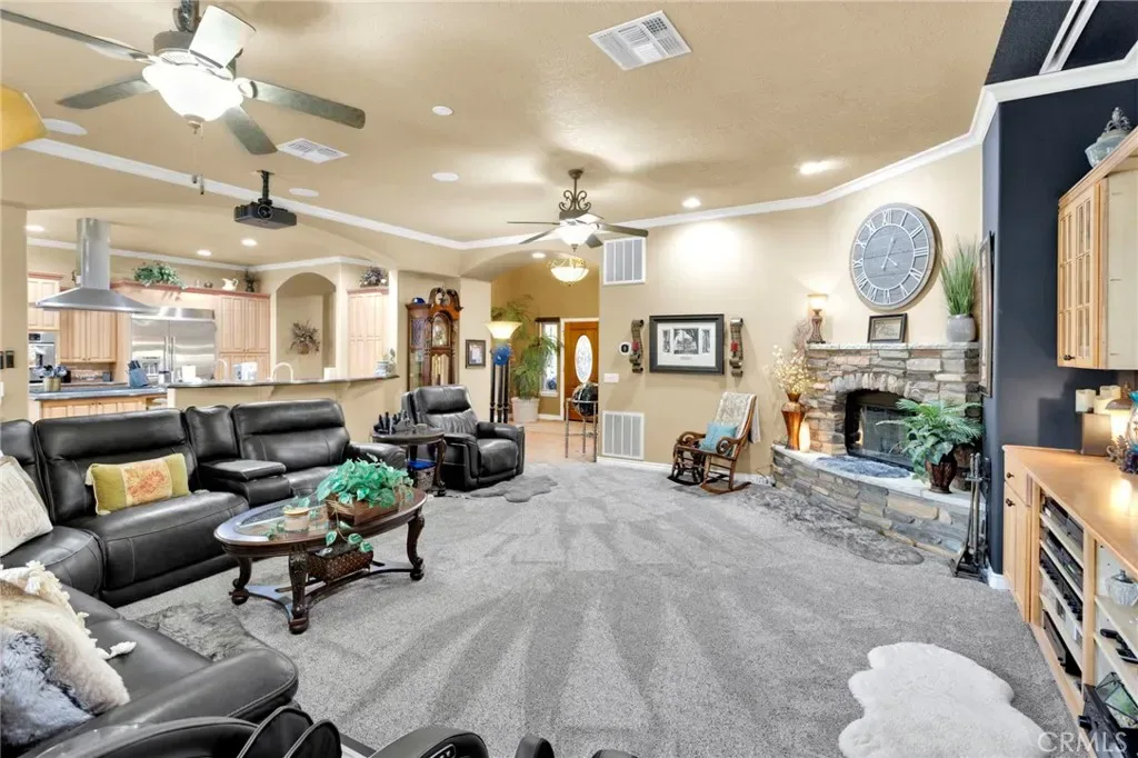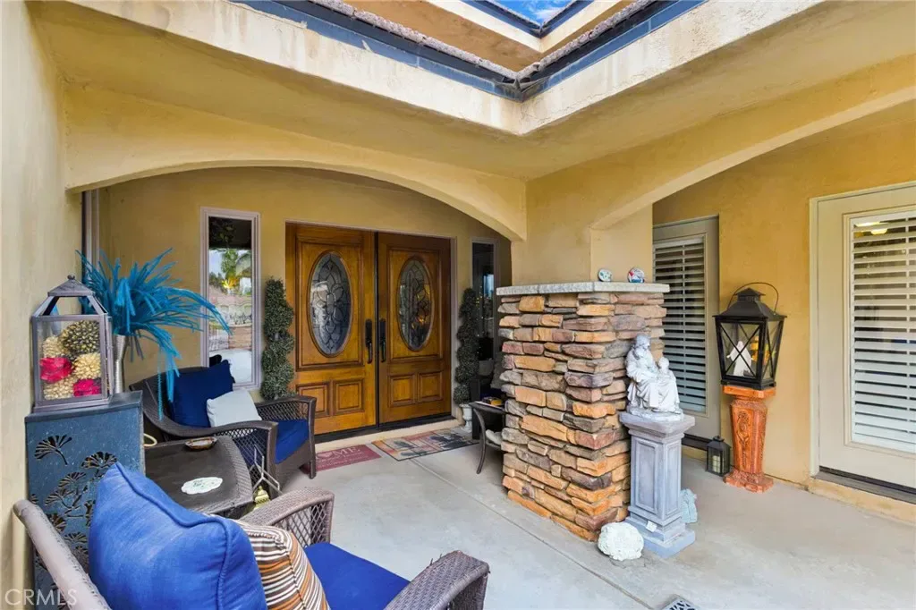 Open and bright 4 bedroom and office/den with 3 full and one half baths. Gated courtyard leads to grand entry and large living/great room off of open kitchen with stainless steel dual ovens, warming drawer, built-in refrigerator, massive 8 burner cooktop stove, trash compacter, microwave, vent hood, double dishwasher and an additional sink area in the large center island. Great formal dining room with butler’s pantry attached includes a wine cooler and lots of storage. Dining room with fireplace opens to front courtyard. Large primary suite with another fireplace has attached bath consisting of jetted tub, huge walk-in shower with dual shower heads and pass through master closet with built-in cabinets. Wood shutters throughout, ceiling fans in all rooms with 10″ ceilings. Crown molding in kitchen, master bedroom, office and living room, newer carpet and luxury vinyl wood flooring in several rooms. Living room has ceiling projector with drop down and motorized 120″ built-in TV with surround sound and components. Living room black-out shades are motorized as well as small entry windows. Off of the primary suite is an office/den with a wall of built-in cabinets and faces the front of the home. East side of home consists of 3 additional bedrooms, one with a private bath and a central bath in the hallway. Indoor laundry room has lots of storage and a hook up and space for an additional refrigerator. Laundry leads to one car garage that opens to another 3 car garage. Expansive driveway provides ample parking for additional vehicles, and RV and boat. Outside, enjoy a private covered pool and spa, lots of concrete patio areas and mature landscaping. Enjoy all the amenities Stonebrook Estates has to offer. Quiet and serene, private and secure! Come see for yourself!!
