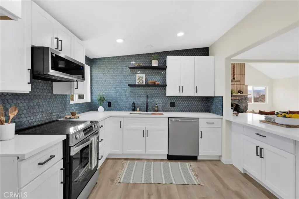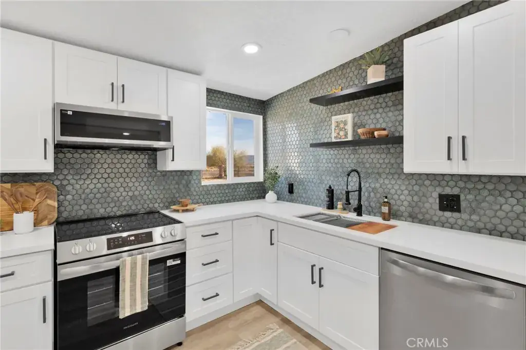 DESERT MODERN meets 1.25 ACRES of opportunity. This FULLY REMODELED 4-Bed, 2-Bath home showcases an OPEN, AIRY FLOOR PLAN with NEW WINDOWS, UPDATED FLOORING, and a stunning STATEMENT FIREPLACE with custom detailing, plus a SECOND FIREPLACE for added ambiance. The DESIGNER KITCHEN features new sleek cabinetry, new STAINLESS STEEL APPLIANCES, a spacious ISLAND, and a fun BACKSPLASH that adds the perfect pop of personality & modern edge. Both BATHROOMS are FULLY REMODELED with clean, contemporary finishes. Outside, enjoy endless potential with TWO DETACHED GARAGES ideal for storage, hobbies, or your desert lifestyle. MOVE-IN READY. MODERN and Unique