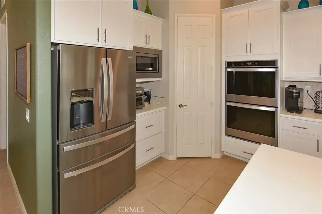 The chef-style kitchen features quartz countertops, a walk-in pantry, and a large oversized island that anchors the living space, ideal for gatherings and everyday living.