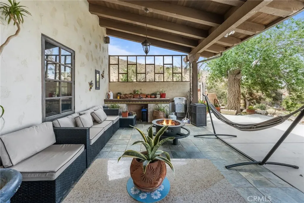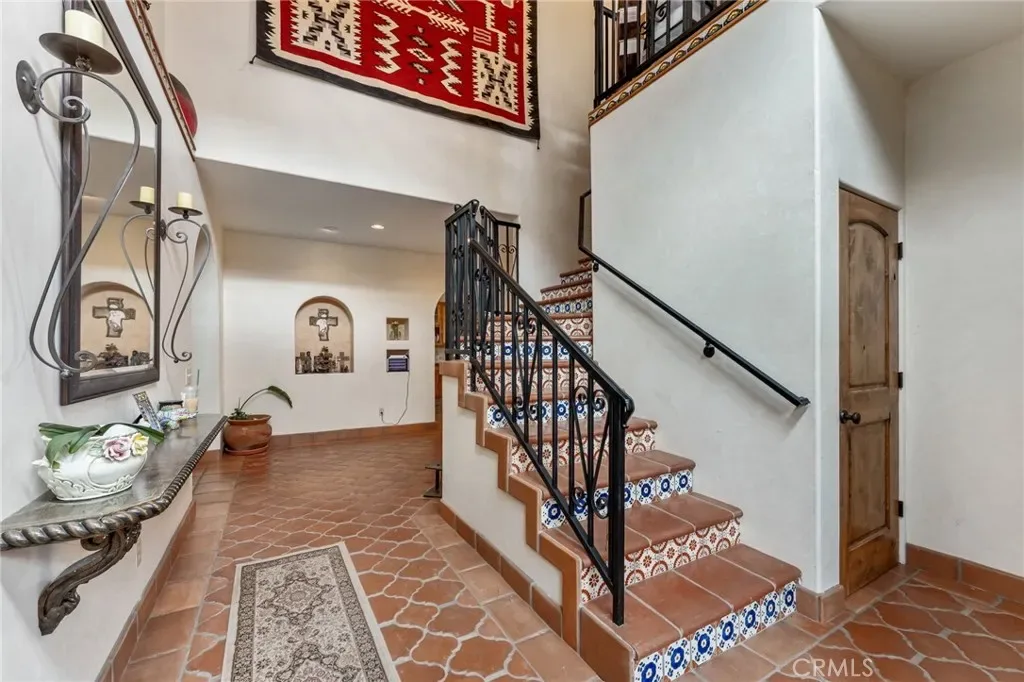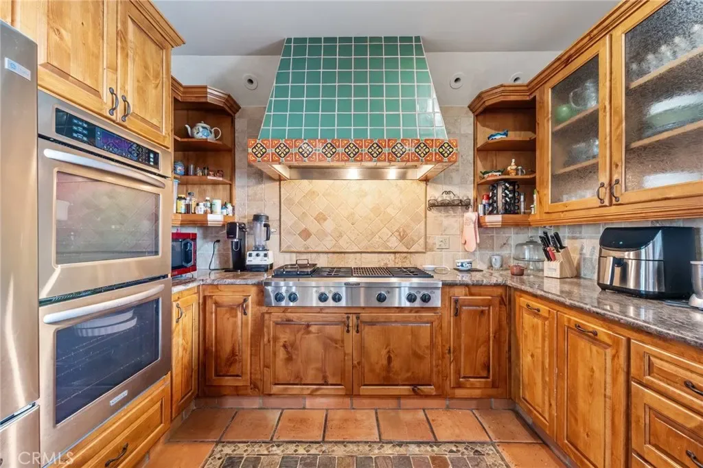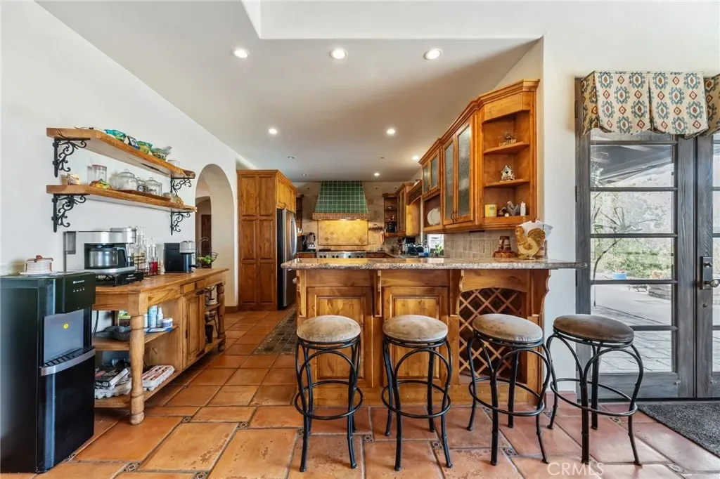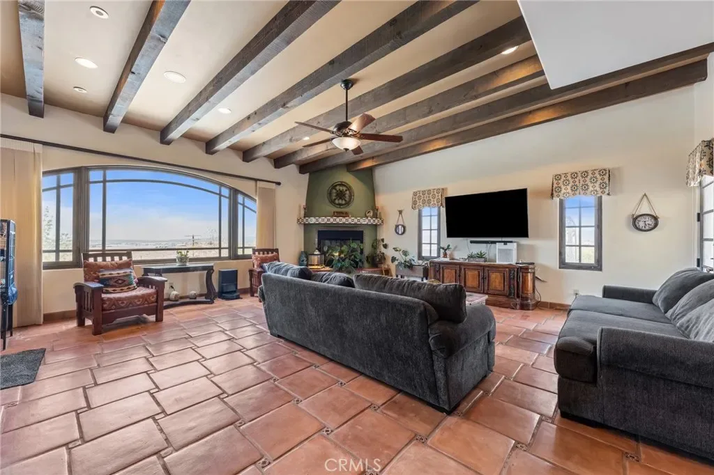 Throughout the home you’ll find high ceilings with exposed beams, arched details, custom tile flooring, stained alder doors, and handcrafted finishes that capture the warmth and character of a classic Hacienda. The family room features a wood-burning fireplace set within a curved hearth wall and a dramatic 14-foot arched picture window.