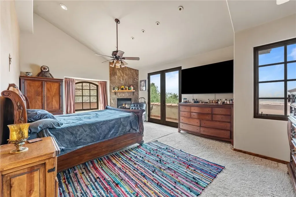 The home includes two primary suites, each with a private bathroom, one of them with independent entrance, along with two additional spacious bedrooms. The upstairs primary suite has French doors to a private balcony with panoramic views, a fireplace, large walk-in closet, and a luxurious bathroom with stone shower and oversized soaking tub.