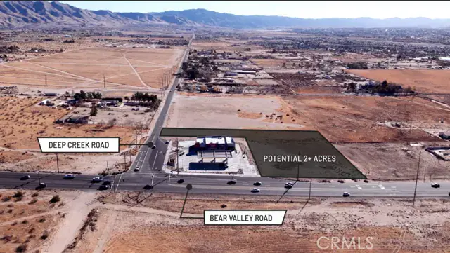 New sewer line in Bear Valley Road, traffic signal and power poles have been relocated at adjacent property. Water and gas in street. Land is generally flat, with great views! Seller willing for Buyer to do parcel map and sell separately: approx 2 acres of frontage on Bear Valley w/additional Deep Creek access at $10/sqft. Remainder of approx 9 acres of frontage on Deep Creek at $4/sqft. Buyer to pay costs of any split.