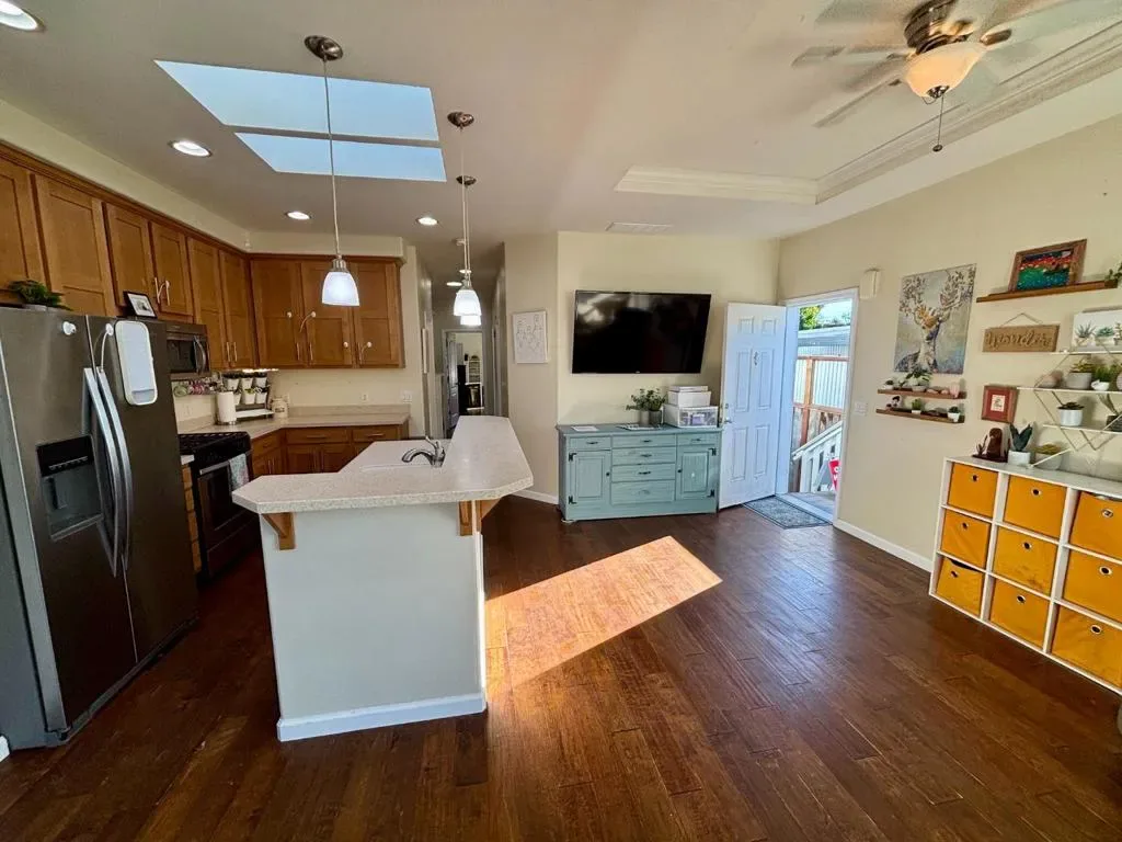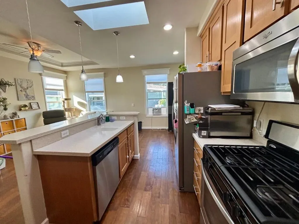 Coastal living awaits in this modern double-wide, 3-bedroom, 2-bath home in a desirable all-age, resident-owned co-op park in Aptos. Built in 2015 and ideally located near the beach, Aptos village, and sought-after local schools, this light-filled home features an open-concept floor plan, hardwood-style flooring, and a spacious living area that flows seamlessly into the bright kitchen. The kitchen is well-appointed with dishwasher, range/oven, refrigerator, microwave, and garbage disposal, and offers generous counter space, perfect for entertaining or everyday living. The primary suite provides a private retreat with an ensuite bathroom and a walk-in closet. Two additional generously sized bedrooms offer flexibility for guests or a home office. Additional highlights include a small fully fenced yard with shed (approx. 7′ x 11′), covered carport parking for two vehicles, and an in-unit laundry room with hookups. Palm Terrace Estates is a resident-owned community offering coastal living in the heart of Aptos. Home must be owner-occupied as a primary residence. Please park only in the carport or designated visitor parking. Disclosures available. HOA monthly fee is currently $600.