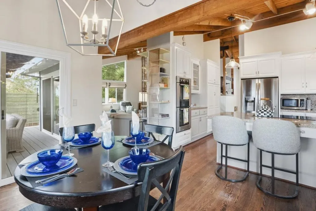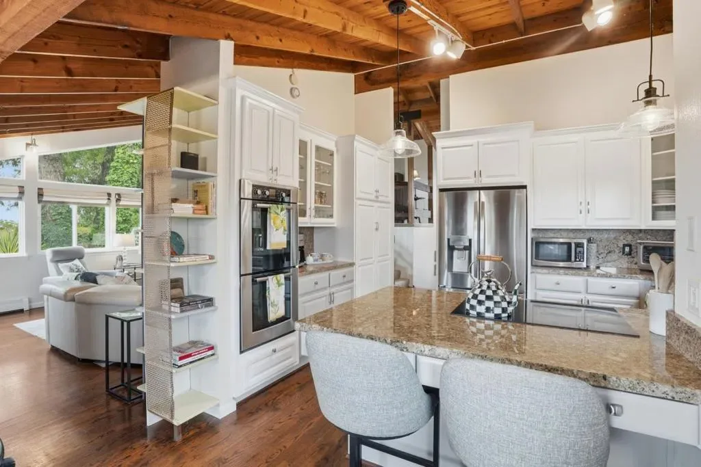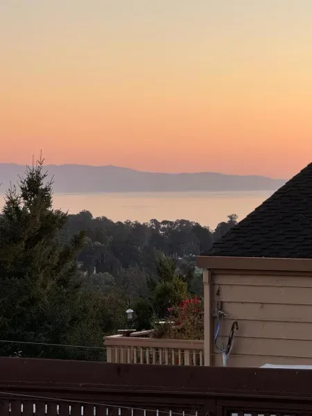 This private home in the Aptos hills less than five minutes above the village, pairs sweeping ocean and mountain views with storybook gardens on over an acre of land. High open-beam ceilings and expansive windows flood the main level with natural light and frame views of the bay and surrounding hills. The kitchen and dining area open to a welcoming patio, ideal for sunset dinners, sunrise coffees, weekend brunches, and easy indoor outdoor entertaining. Three bedrooms and 2.5 baths include a calm primary suite oriented to soft morning light with garden views and an expansive primary bath. Upstairs, a spacious loft room with bay views flexes beautifully as a media room, studio, or home office. Outside, terraced, drought tolerant gardens with roses and productive fruit trees create a private, year round oasis, complemented by a quiet sitting area under a majestic redwood grove. A covered back deck overlooks the gardens and hills, while a detached two car garage and generous parking for an RV, boat, or guests make hosting effortless. Five minutes to New Leaf and Aptos village, 15 mins to Capitola and 20 minutes to Santa Cruz.