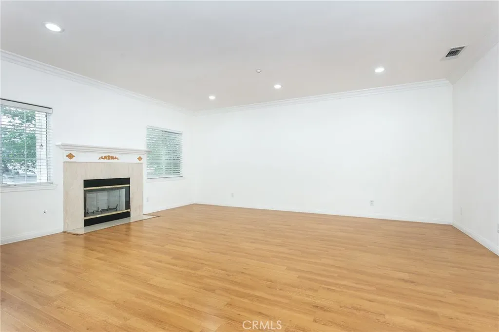 The spacious living room features a fireplace with a stone tile surround, while natural light fills the space, creating a warm and inviting atmosphere. An adjacent nook is ideal for a home office or study.