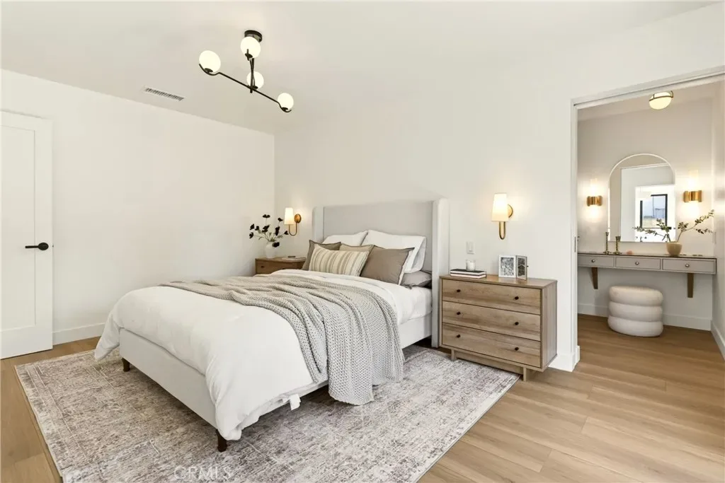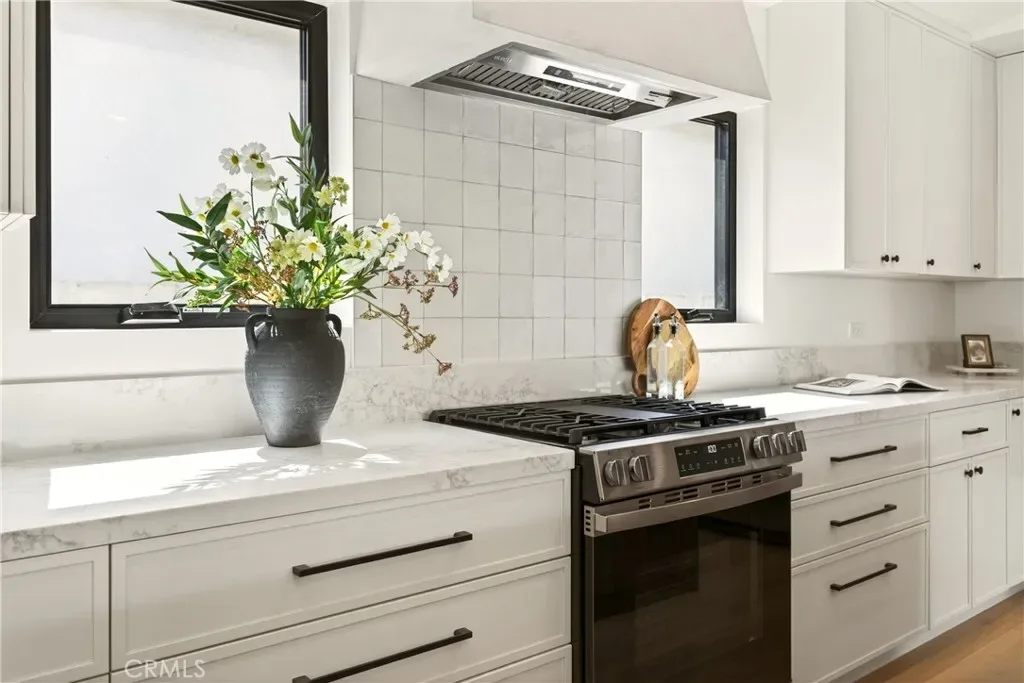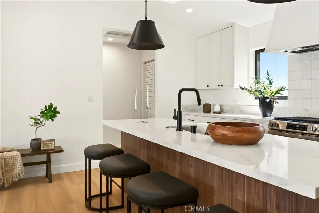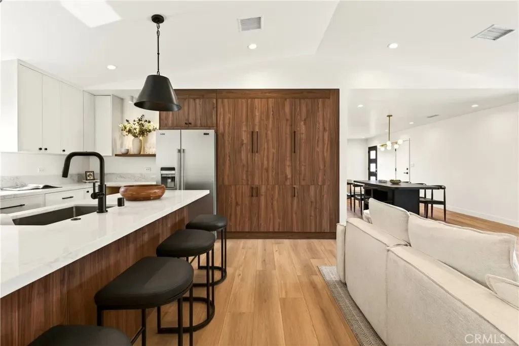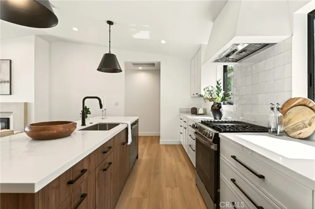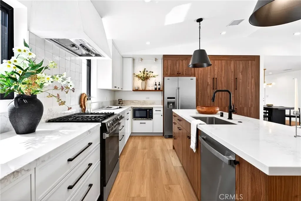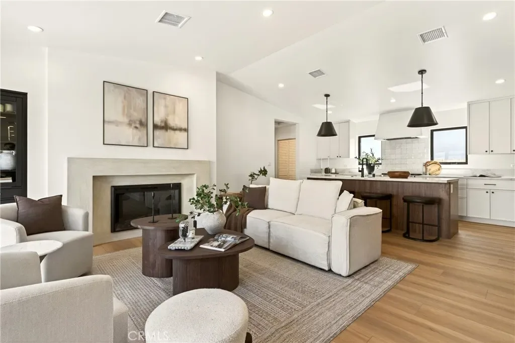 A study in modern California living, this fully reimagined Arcadia residence blends architectural intention, refined materiality, and everyday functionality into a home that lives as beautifully as it looks. Expanded with a fully permitted 920 square foot addition, the property has been thoughtfully transformed and curated by 8A Interiors, where every line, texture, and finish creates a cohesive, elevated living experience. The exterior introduces a clean, contemporary presence, smooth stucco softened by warm wood accents, framed by new landscaping, lush sod, and intentional hardscape. New Milgard windows and doors invite natural light, while updated roofing, fascia, and systems support both form and longevity. Inside, vaulted ceilings and open sight lines create a sense of volume and ease. A sculptural fireplace anchors the living space, while expansive sliding glass doors blur the boundary between indoors and out. The kitchen serves as both centerpiece and workspace, featuring clean lines, custom cabinetry, a statement island, new appliances, and elevated finishes that balance style with performance. Privately situated, the newly constructed primary suite offers a quiet retreat with a custom walk-in closet and spa-like bathroom defined by refined textures, curated lighting, and a calming palette. A complete rebuild ensures modern efficiency with new plumbing, electrical, HVAC, ductwork, and a 200-amp panel with EV capability. Wide plank flooring, layered lighting, and tailored details create a consistent design language throughout. Outdoor spaces offer a private setting with new irrigation, concrete work, vinyl fencing, and thoughtfully selected landscaping for low maintenance and visual serenity. Located minutes from Arcadia’s premier destinations and the vibrant energy of Old Town Monrovia, this is more than a renovation—it’s a complete architectural re-envisioning designed for comfort, style, and connection.