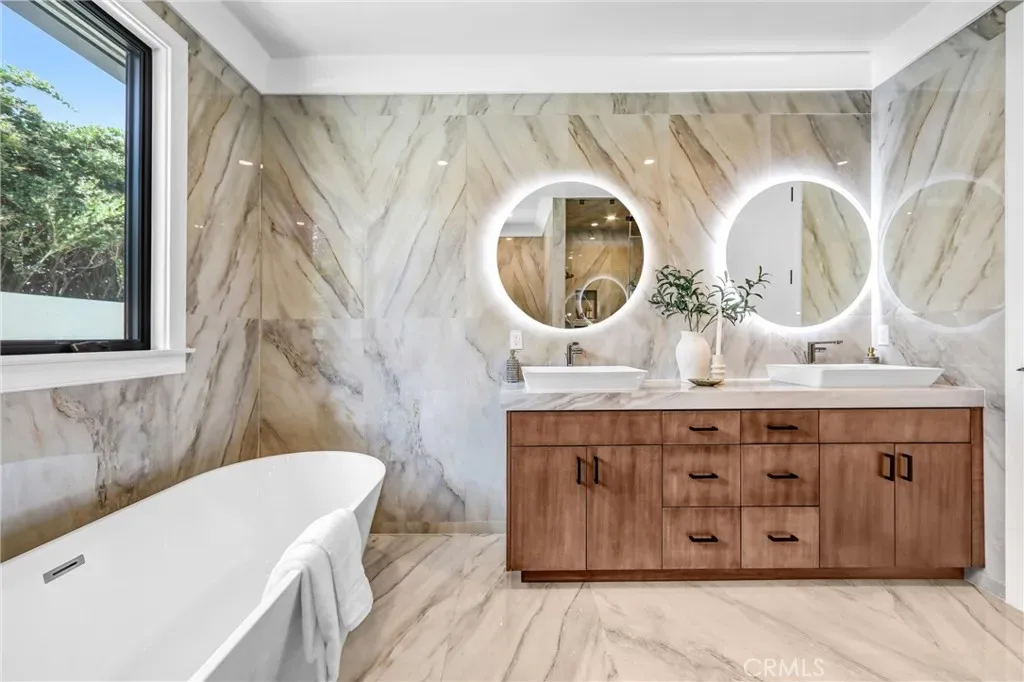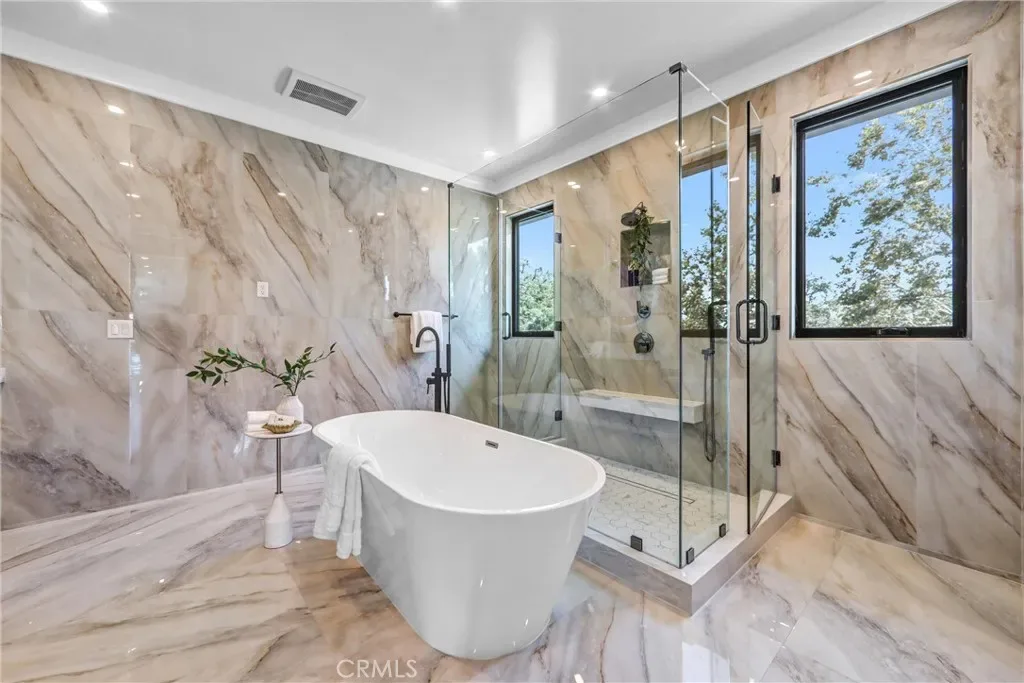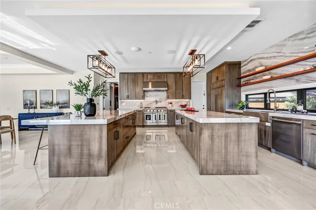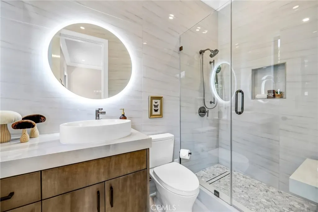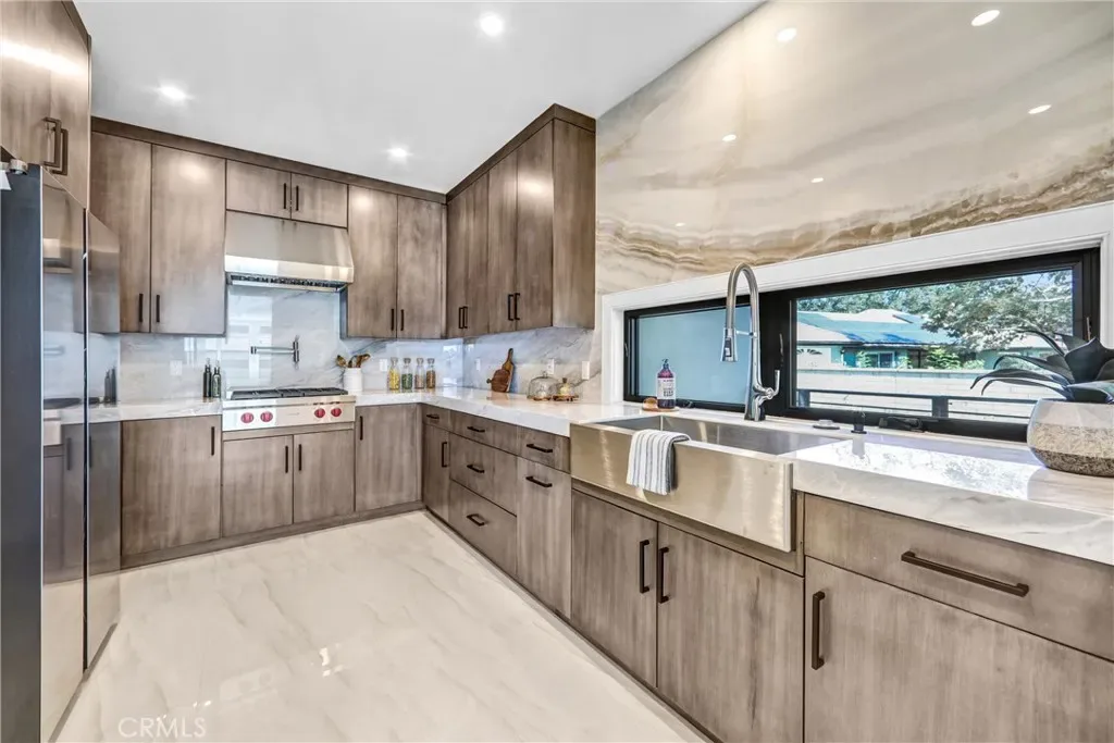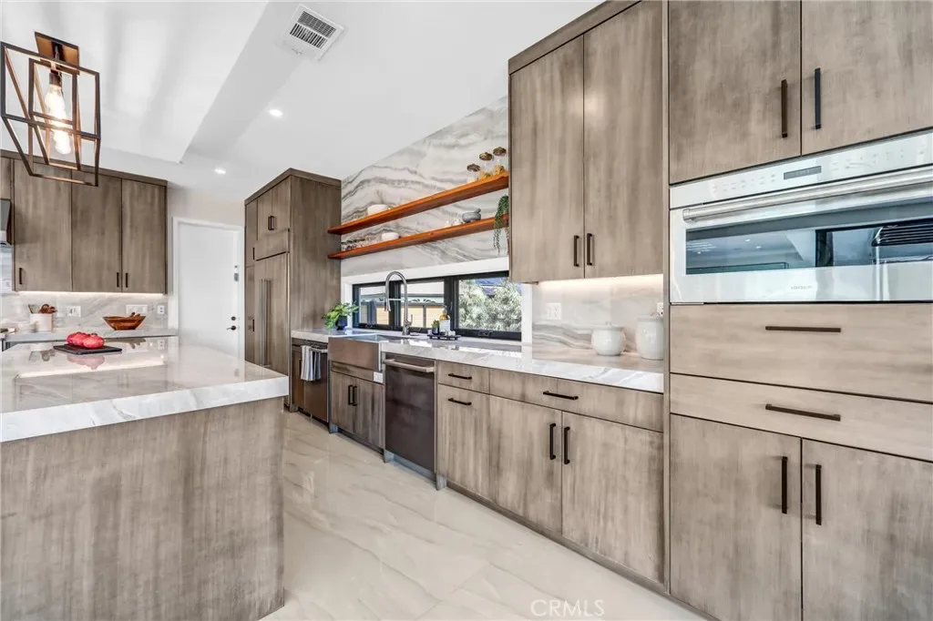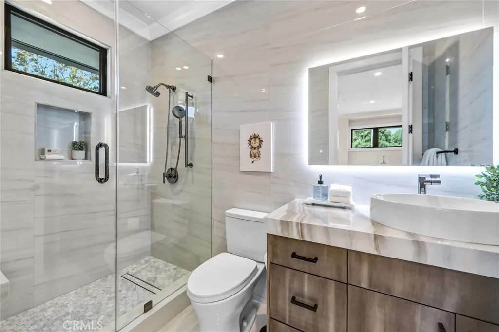 In that backyard oasis, you can entertain under the pergola, dine in the lanai under the built-in infrared heaters, or gather around the poolside firepit. The infinity-edge spa & pool has to be seen in person! The ADU/poolhouse includes a kitchen, bedroom & bathroom – with all the same high-end materials found in the main house.