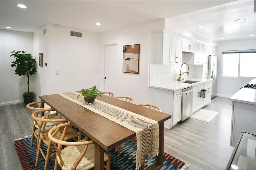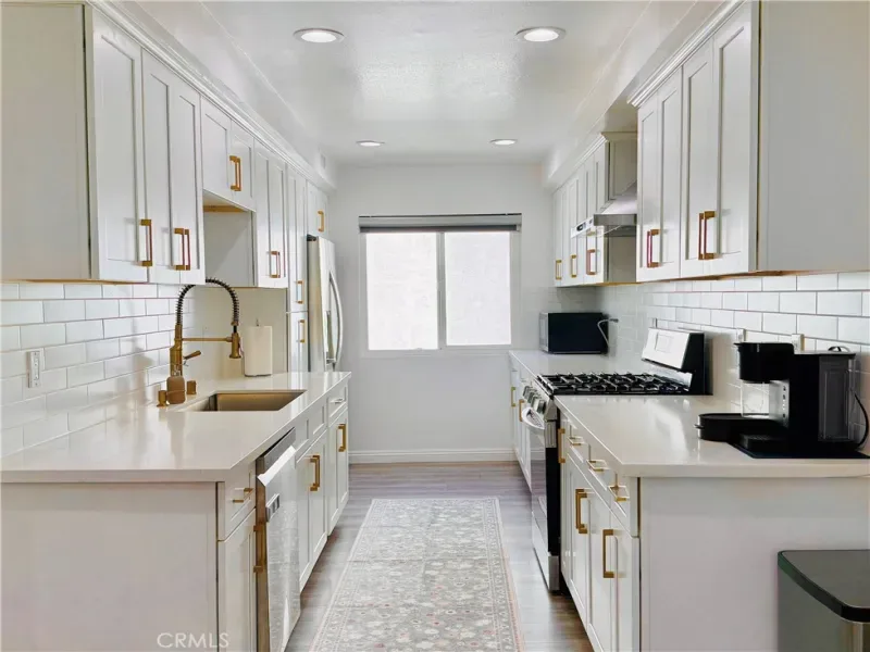 The inviting living room features an elevated ceiling design, abundant natural light, and a cozy fireplace, creating a warm and welcoming atmosphere. A sliding glass door from the living room leads to a private patio, perfect for outdoor relaxing. The fully upgraded kitchen showcases white shaker cabinetry, quartz countertops, modern appliances, and stylish finishes, seamlessly connecting to the dining and living areas for easy entertaining.The renovation completed in recent years includes new vinyl flooring throughout, full interior copper repiping, updated electrical wiring with recessed lighting, all windows and a sliding door, and refreshed bathrooms with new tile, waterproofing, modern vanities, and toilets.