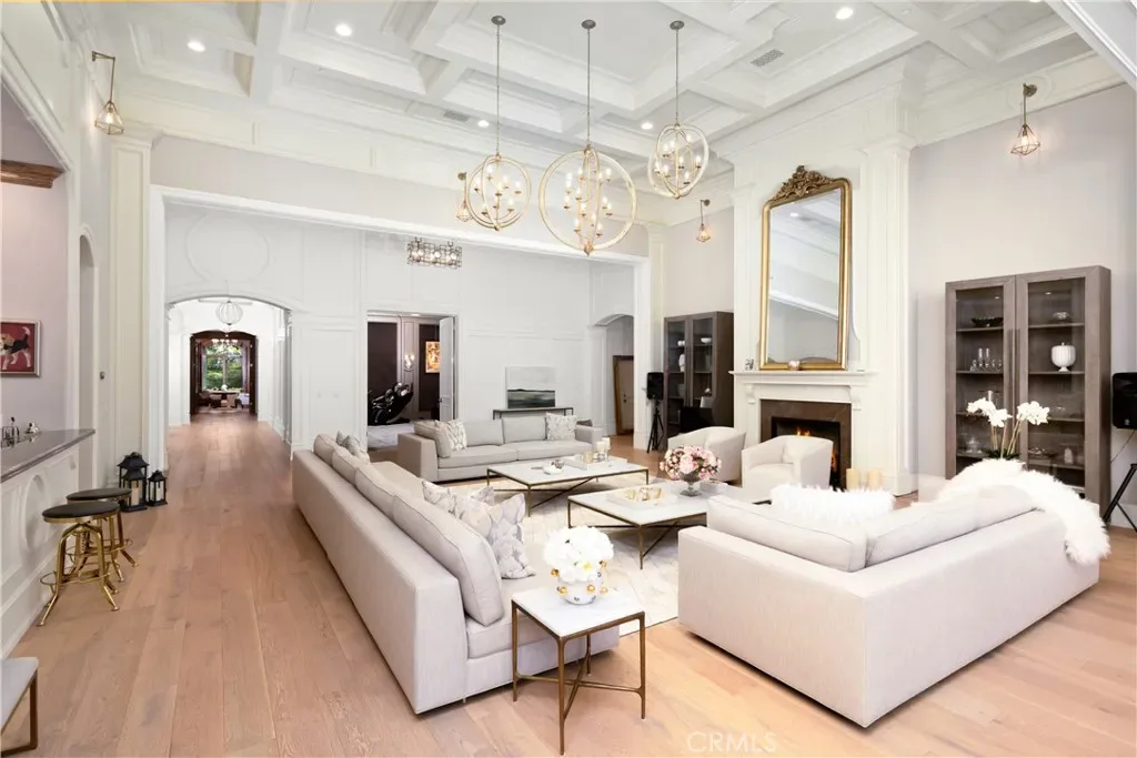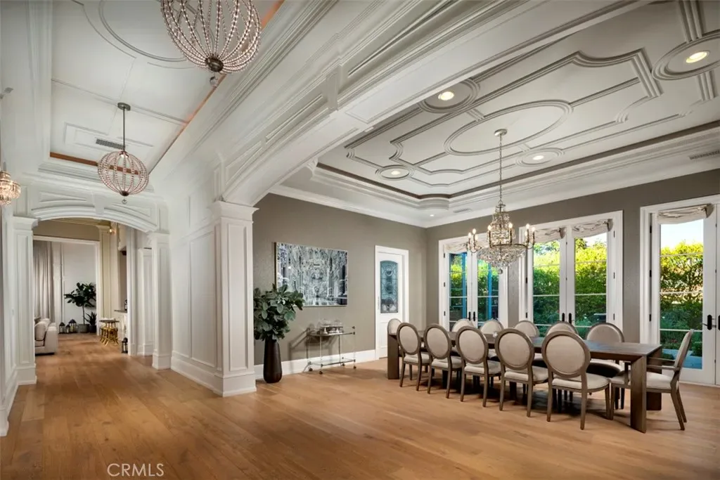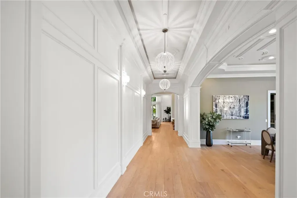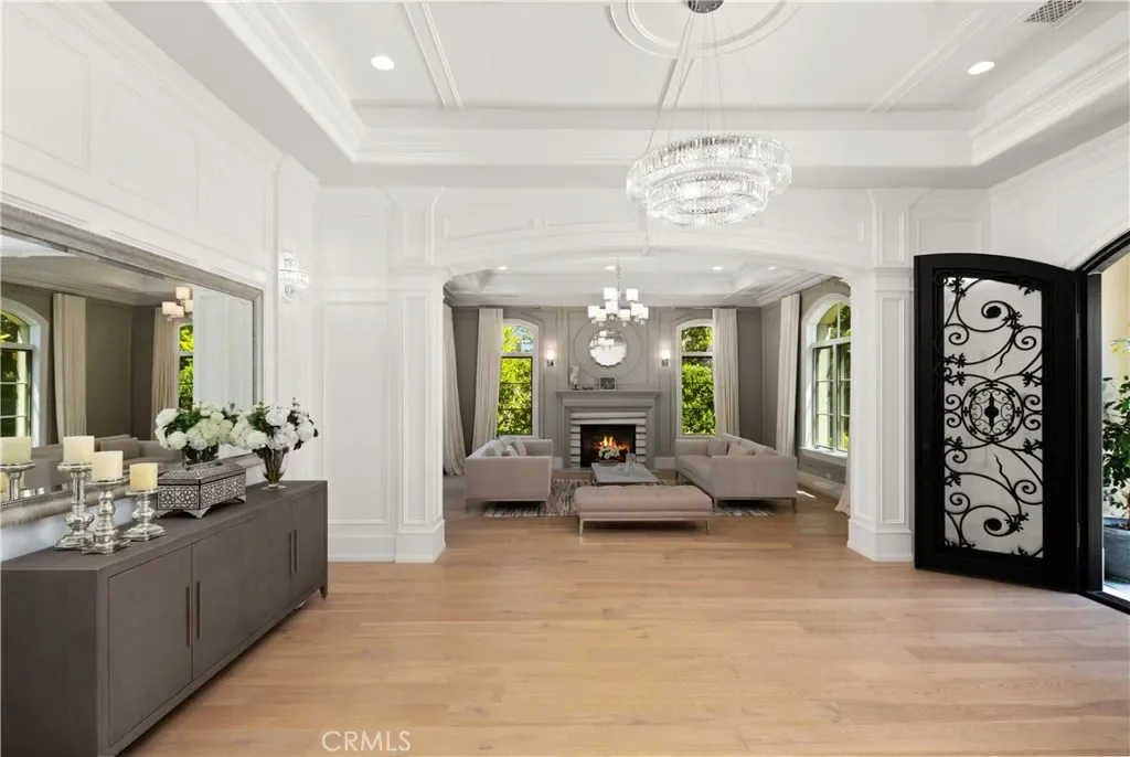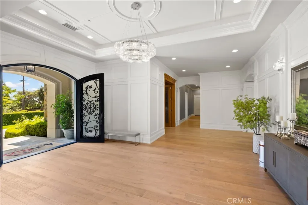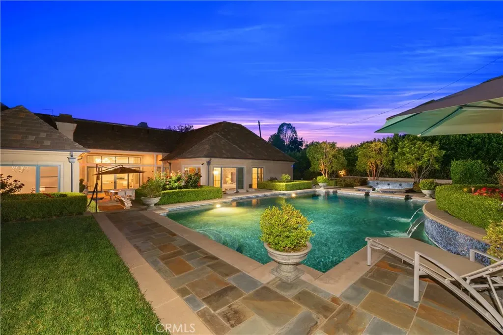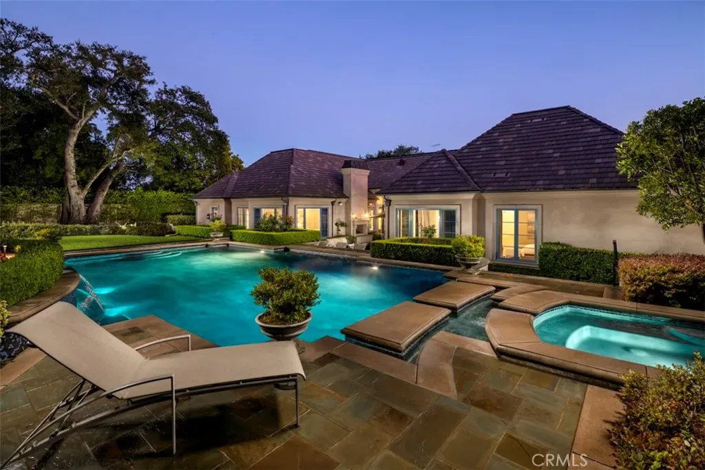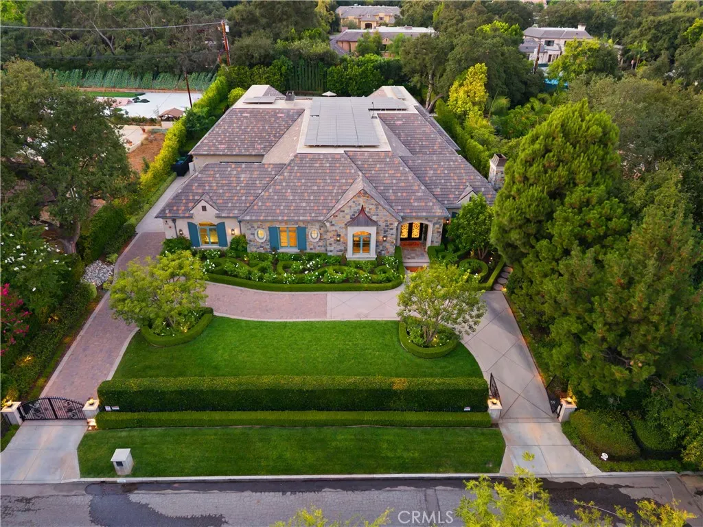 A Rare 10,422-Square-Foot French Estate in Prestigious Santa Anita Oaks, Set within Arcadia’s esteemed Upper Rancho Area of Arcadia, this extraordinary French-inspired estate presents over 10,000 square feet of rare single-level living on nearly an acre of beautifully landscaped grounds. Designed by the reputable Robert Tong and built by Mur-Sol Construction, this residence embodies timeless elegance, modern luxury, and superior craftsmanship. Behind its stately façade behind multiple large hedges and gated circular driveway, interiors unfold with grand proportions, soaring ceilings, and exquisite detailing throughout. The magnificent family room, crowned by a Cathedral High coffered ceiling and illuminated by a Gold Czech crystal chandelier, serves as the dramatic centerpiece of the home. Formal living and dining rooms offer refined settings for entertaining, while a richly appointed paneled study, an expansive home theater, and a private fitness room with sauna provide a wealth of lifestyle amenities. Throughout the home, custom designer draperies add sophistication and warmth to every space. At the heart of the estate, the gourmet kitchen impresses with dual marble-topped islands, professional-grade appliances, and bespoke cabinetry, paired with a fully equipped secondary wok kitchen for seamless entertaining. Six ensuite bedrooms, including a serene and extremely large primary suite with a spa-inspired bath of imported marble and European finishes, provide privacy and comfort for family and guests. The estate’s outdoor setting is equally remarkable, designed as a private resort retreat. Mature oak trees and lush landscaping frame a vast grassy lawn, an entertainer’s saltwater pool and spa, and an elegant stone terrace with outdoor fireplace. A circular driveway and a four-car attached garage ensure both prestige and convenience, with parking capacity for more than ten additional cars on the grounds. Enhancing the property’s value and efficiency are paid-off solar panels, offering sustainable living without compromise. Distinguished not only by its scale but also by its rare single-story design, this residence offers a lifestyle of enduring elegance, comfort, and exclusivity—all just moments from Arcadia’s award-winning schools, parks, dining, and cultural destinations.