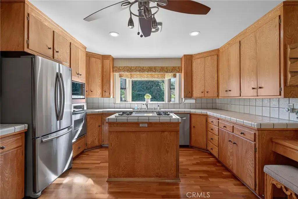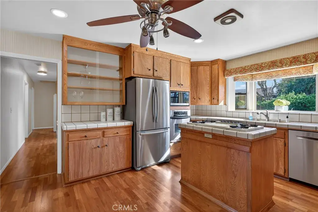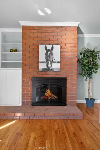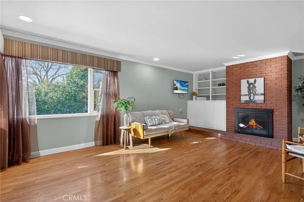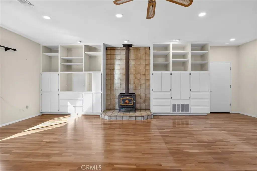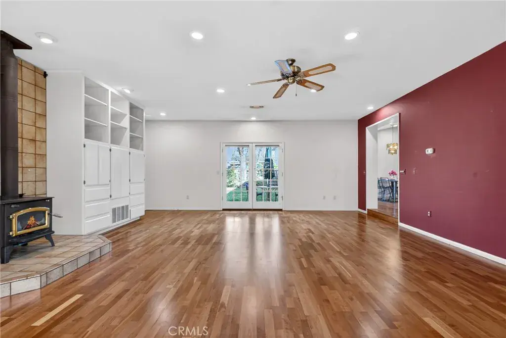 Upon entry, the living room features a gas fireplace and large picture windows that bring in natural light. The kitchen and dining area sit between the living room and family room, offering a practical and functional layout. The kitchen includes ample storage with custom pull-out drawers, a cooktop, and separate oven. Remote-controlled roller shades at the kitchen window provide adjustable light and privacy with views of the grassy front yard. Just beyond, the family room offers additional space to relax or entertain, featuring a freestanding wood-burning stove and French doors that open to the backyard, creating a natural connection to the outdoor space.