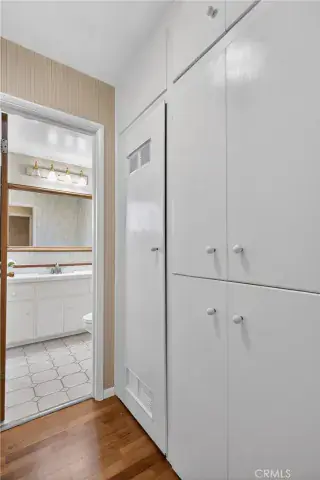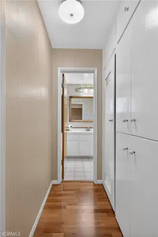 All three bedrooms feature ceiling fans and closets with built-in shelving. The primary bedroom includes a nicely sized closet and an en-suite bathroom with walk-in shower, vanity area, and bidet. The laundry area is conveniently located just off the primary bathroom and includes cabinetry for added storage. The second bathroom, located off the hallway near the kitchen, features a vanity and tub-shower combination, ideal for guests or everyday use. Low-maintenance laminate wood flooring runs through most of the home, with tile flooring in both bathrooms and the laundry area.