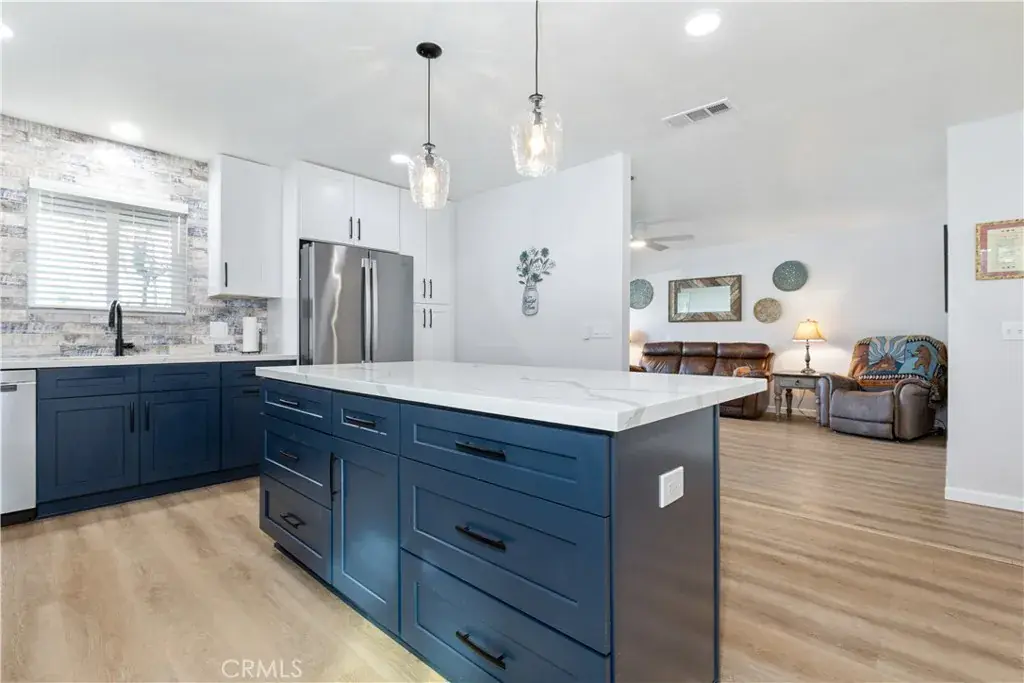 The interior welcomes you with a bright, open living space enhanced by updated flooring and expansive windows. The fully remodeled kitchen stands as a sophisticated centerpiece, showcasing custom cabinetry, solid surface quartz countertops, stainless steel appliances, and an impressive island designed for both culinary preparation and elevated entertaining. The guest bath has been luxuriously reimagined with a tiled shower, modern vanity, and designer finishes. All bedrooms are quietly tucked away toward the rear of the home, offering a peaceful retreat with ceiling fans, and dual pane windows allowing natural light throughout.