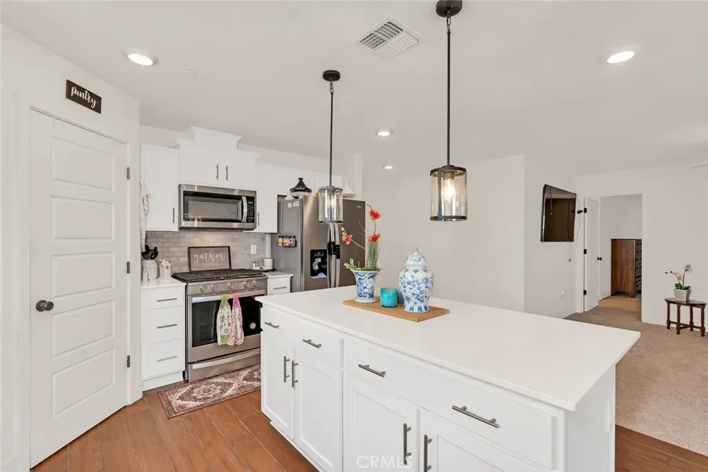 The kitchen features quartz countertops, stainless steel appliances, a gas stove, built-in microwave, pantry, and a convenient bar area—all opening seamlessly to the spacious living room filled with natural light. Refrigerator is included, adding extra convenience for the new owner. Tile flooring enhances both style and durability in the main living areas.
