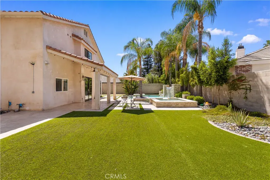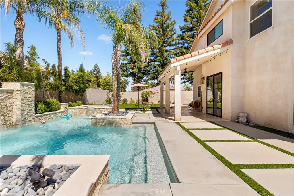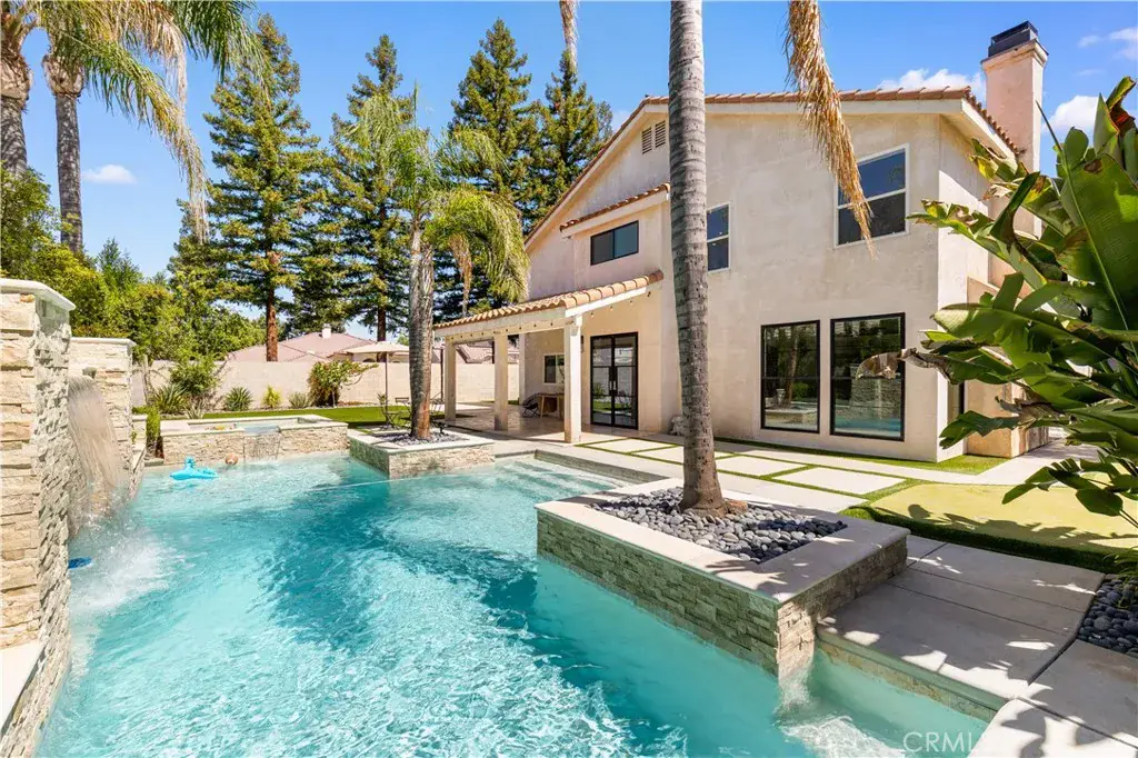 Step outside to your private backyard oasis — a newly remodeled pool and spa with waterfall feature, putting green, and expansive patio space designed for relaxation and entertaining.
