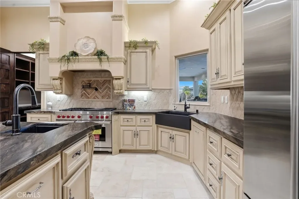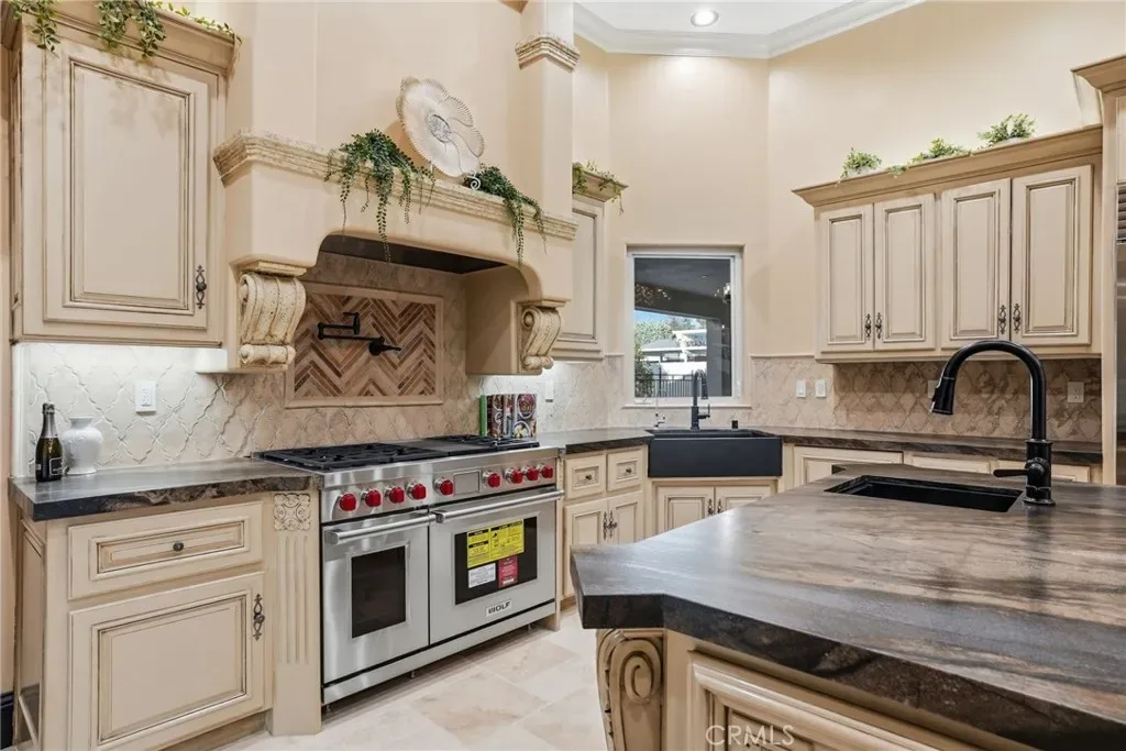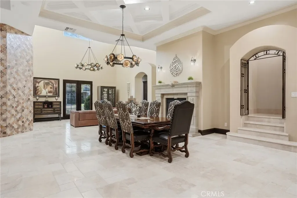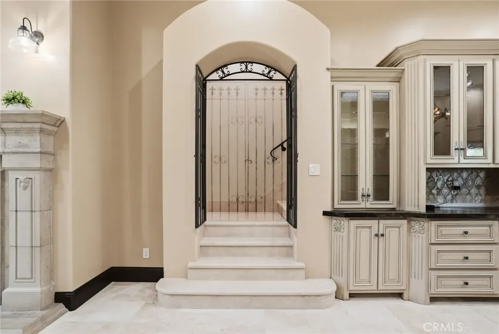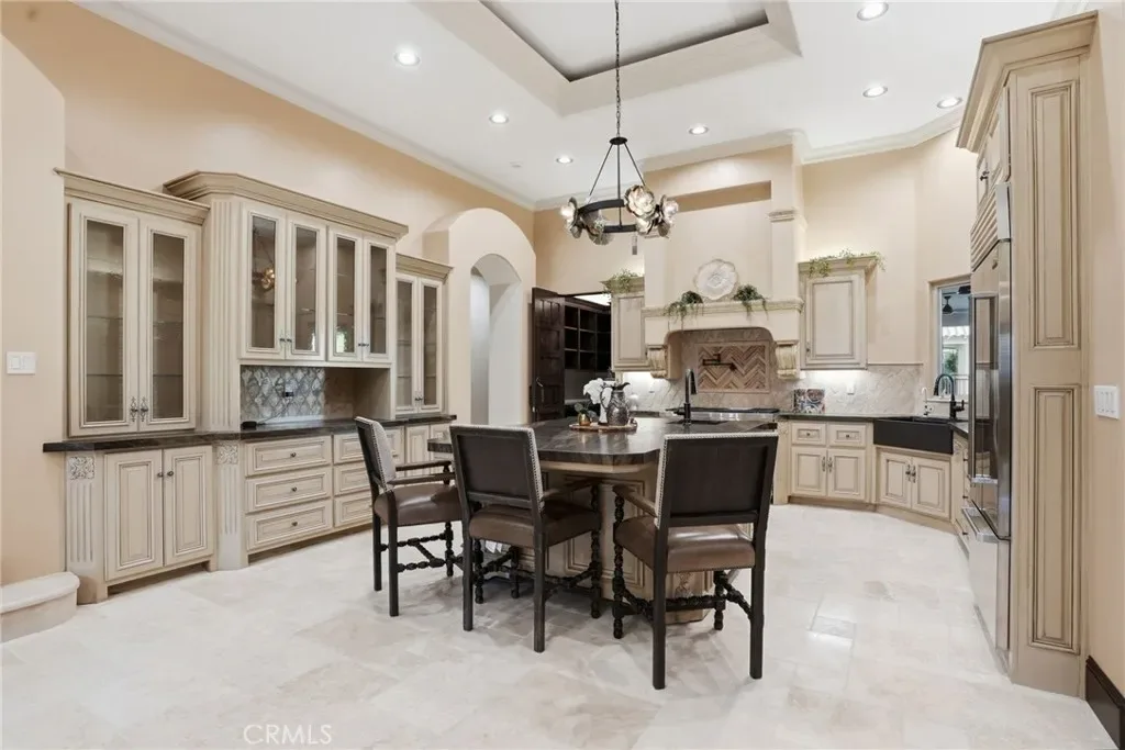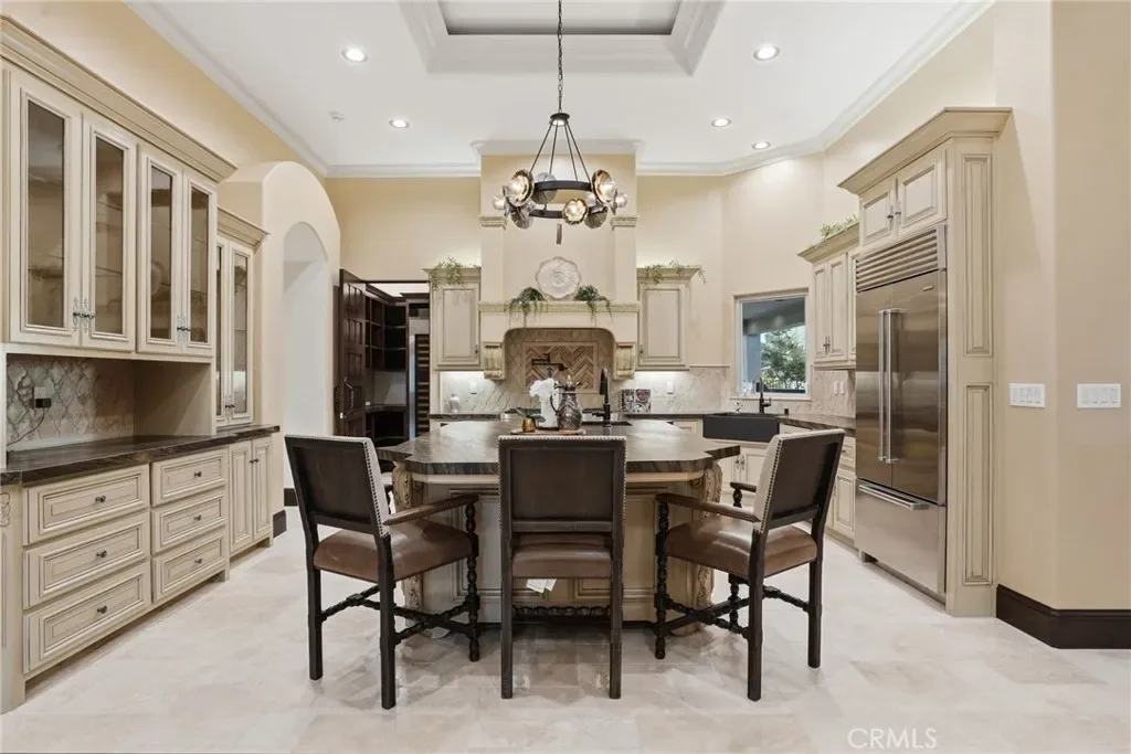 Enter through dramatic double doors into soaring tray ceilings, custom chandeliers, new flooring and paint, and elegant tumbled travertine. The chef’s kitchen includes a Wolf cooktop, expansive walk-in pantry with wine fridge, SubZero built in fridge, and standalone freezer. Wi-Fi extenders provide seamless connectivity throughout.
