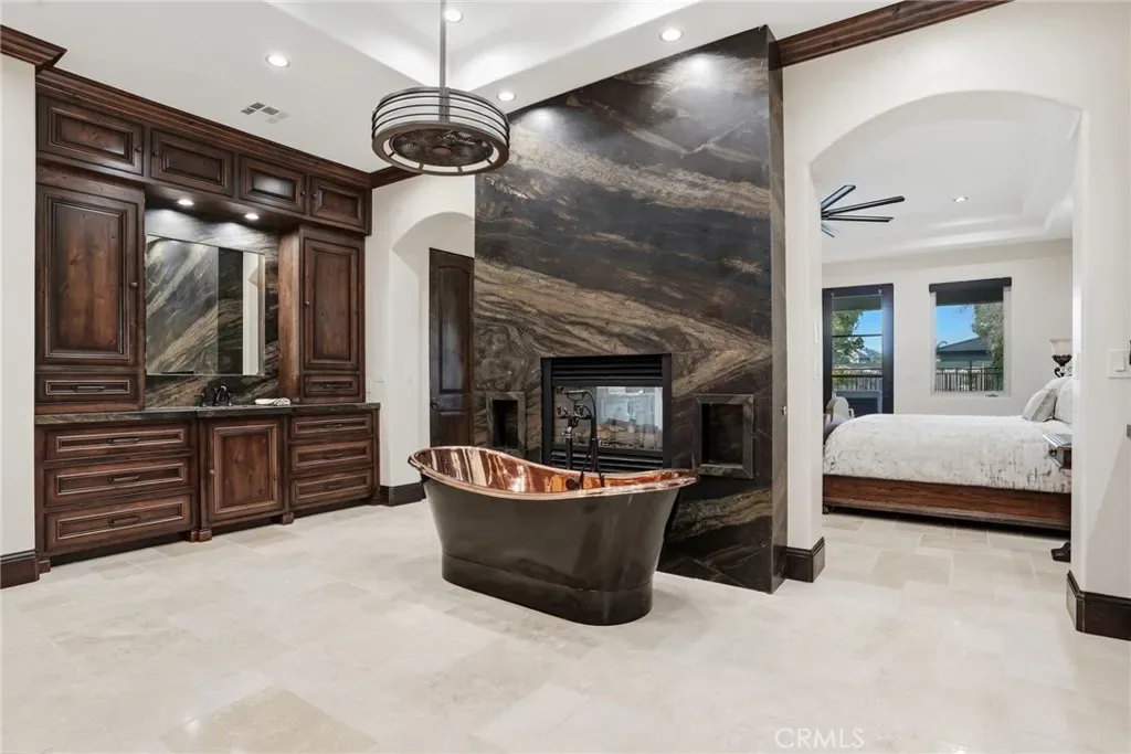 The primary suite is a true retreat with a two-way fireplace, copper freestanding soaking tub, and multi-jet spa shower. Outdoors, enjoy a built-in BBQ and resort-style setting. With 10 garage spaces including an RV garage, new garage doors, large RV parking, privacy gate, and 8-foot solid core doors throughout, this is a rare Bakersfield masterpiece.