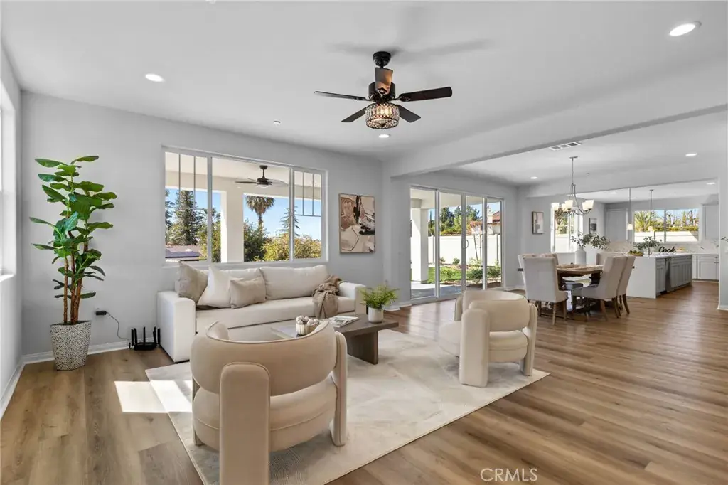 The chef-inspired kitchen boasts a gourmet, oversized eat-in island, hand-selected Quartz countertops, and a walk-in pantry. A family great room and separate living/dining room provide ample gathering space. Experience true indoor/outdoor living with an impressive multi-sliding glass door leading to a large covered patio.