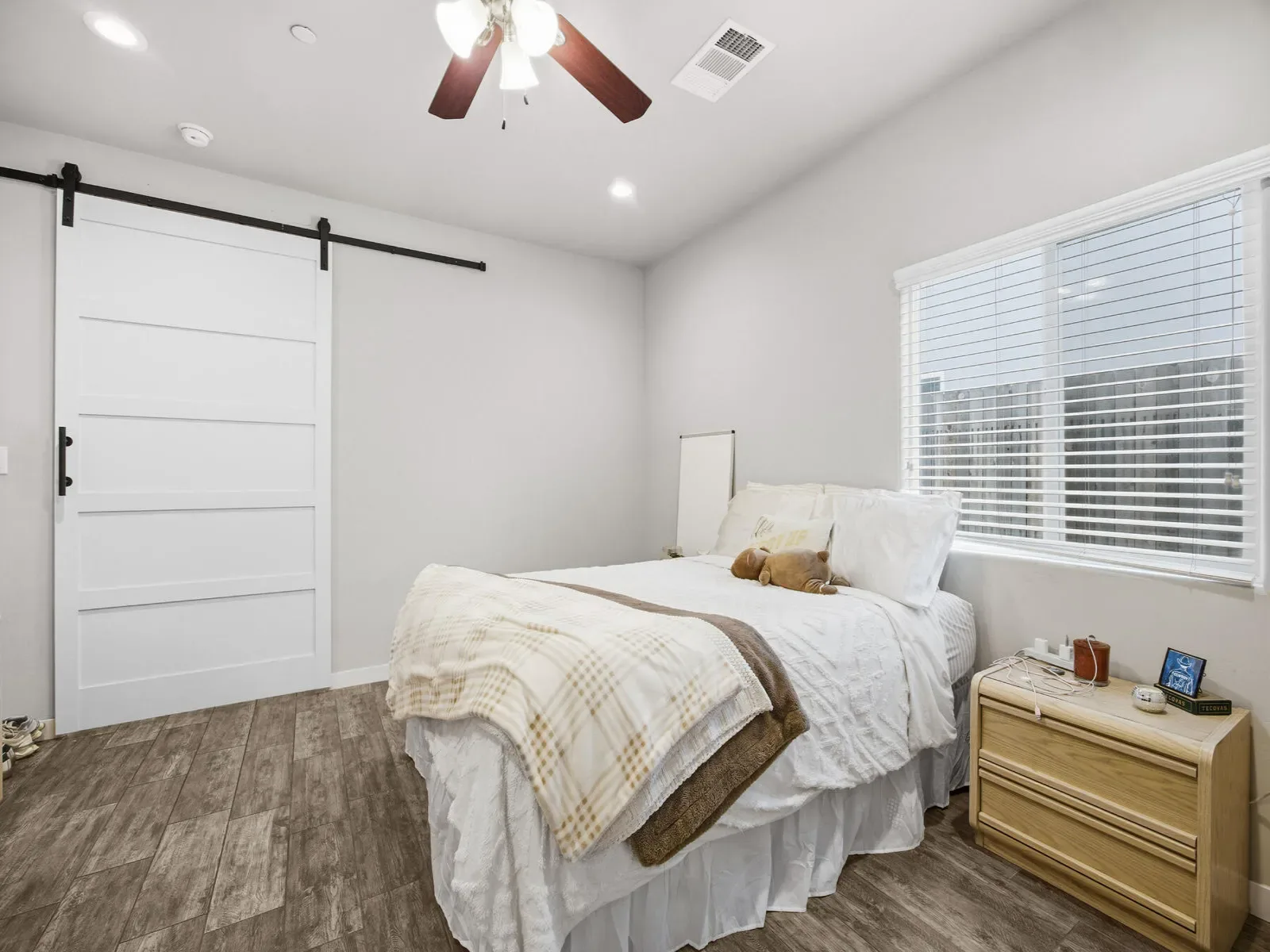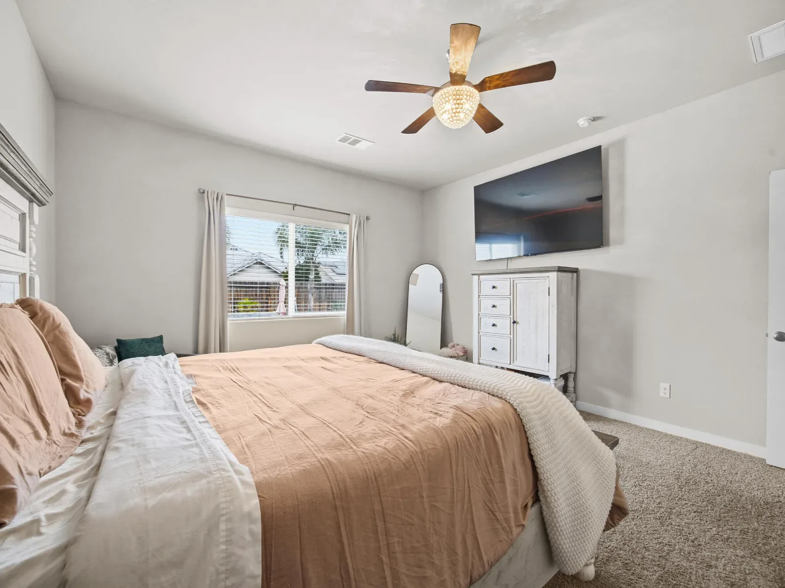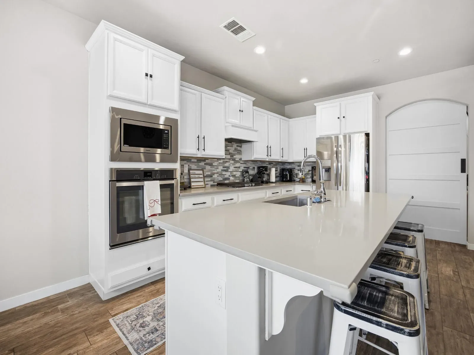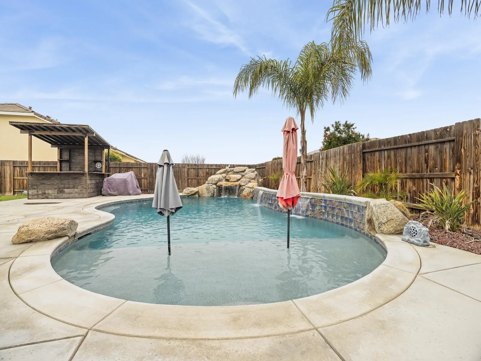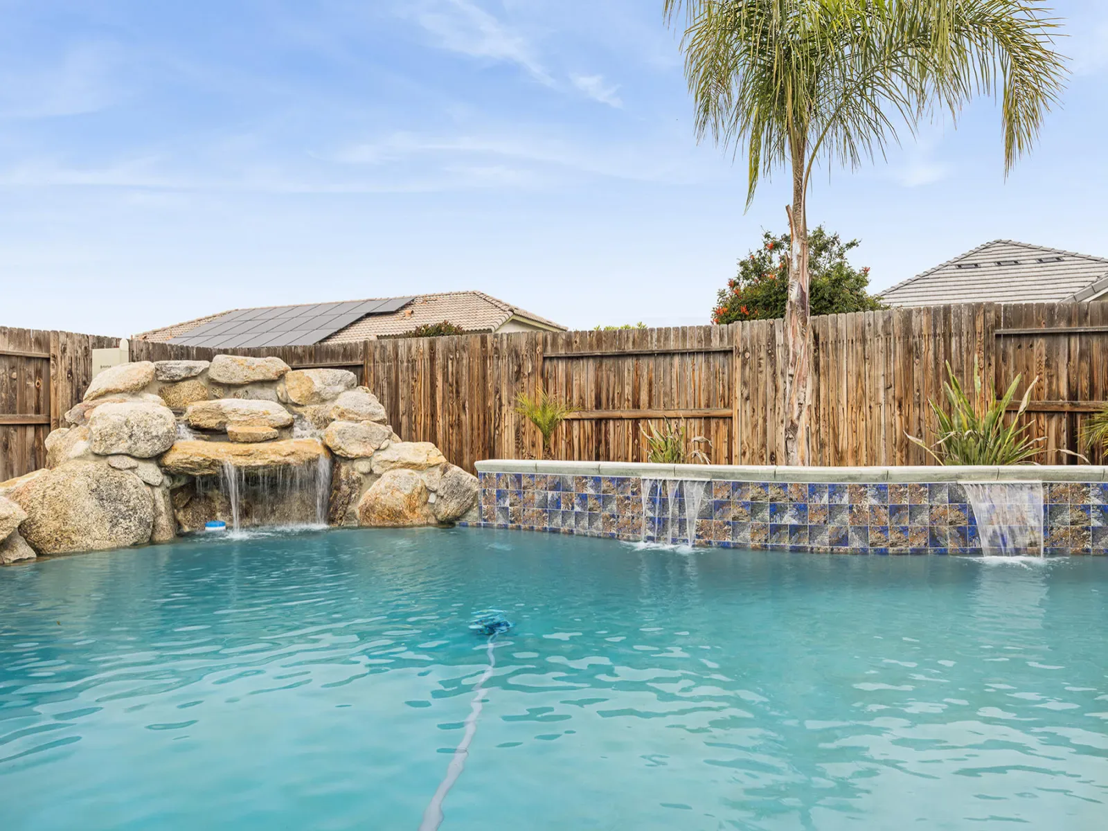 Welcome to this beautifully maintained single-story home in the desirable Bridle Creek community of Southwest Bakersfield. Built in 2017, this residence offers 4 bedrooms, 2 bathrooms, and approximately 2,182 sqft of open-concept living. The bright kitchen features white cabinetry, stainless steel appliances, built-in oven and microwave, large center island with seating, and stylish tile backsplash, flowing into the dining and living areas ideal for entertaining. Wood-look tile flooring, recessed lighting, and high ceilings enhance the inviting atmosphere. The backyard offers a private retreat with a sparkling in-ground pool, spacious patio, covered seating area, low-maintenance landscaping, and built-in bar perfect for gatherings and relaxation. Energy-efficient solar panels provide savings, while the electric vehicle charging station adds convenience. Extended side driveway offers RV or additional vehicle parking. Conveniently located near shopping, dining, and schools.