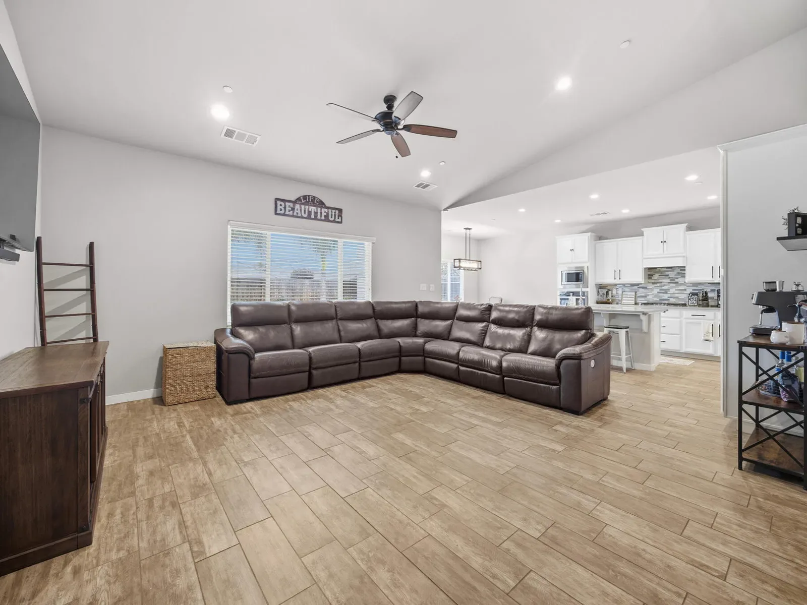 Breakfast Bar, Ceiling Fan(s), Kitchen Island, Open Floorplan, Recessed Lighting, Stone Counters, Vaulted Ceiling(s)