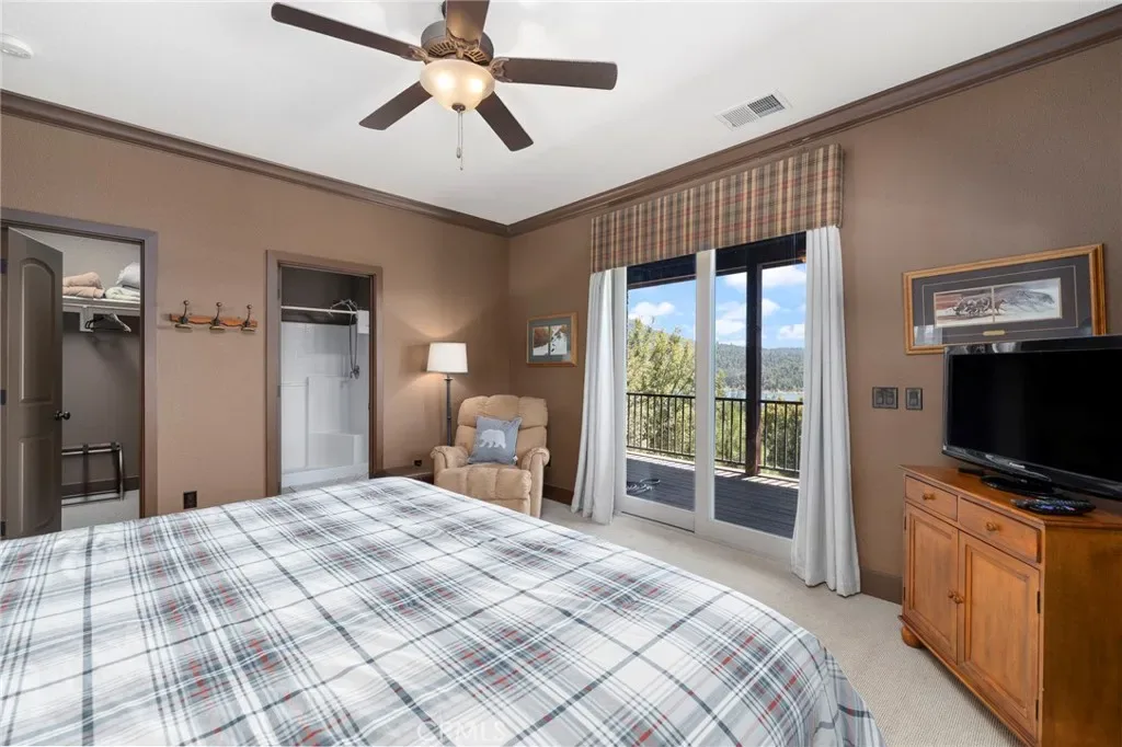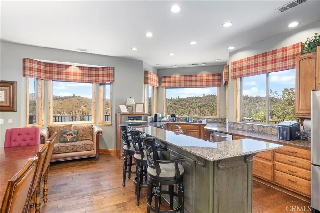 PRICE REDUCED $100,000 on this elegant, custom home in the highly desirable Bass Lake Estates neighborhood. Terrific lake views from nearly every room, & 180 degree views from the wraparound deck. Paved, year round access to the oversized .89 acre parcel, covered in mature oak trees and a lovely rock formation just outside the rear windows. The kitchen features stainless steel appliances including a Jenn-Air stovetop, KitchenAid oven and microwave, and a handy built-in ice maker. The double stainless steel kitchen sink offers panoramic lake views. The spacious living area offers a woodburning fireplace for cooler evenings, knotty pine vaulted ceiling, and sliding glass door access to the outside living space, where you may relax to cooling lake breezes, convenient propane piped BBQ, and propane fire pit. After a day on the lake, each of the 6 bedrooms provides immediate access to either a private bathroom or Jack & Jill bath, each with a step-in shower. The primary suite has a private balcony, dual walk-in closets, step-in shower, and “jetted tub with a lake view”. Central heat and dual zoned AC create year round comfort, and the home is conveniently hooked up to Campora propane, the Bass Lake Water Company, and Madera County sewer systems. This truly remarkable home is priced at a much lower price per square foot than other Bass Lake offerings, and is a successful short term rental property. Make this lovely home your own, and by next July 4th you’ll be viewing the famous fireworks from your front deck!