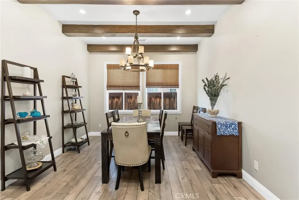 The living room is centered around a cozy fireplace, while the formal dining room impresses with open beam ceilings. A bright sunroom overlooks the backyard, providing additional living space filled with natural light.