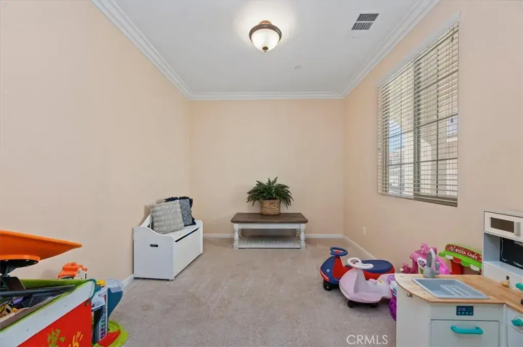 This beautiful home offers 4 bedrooms plus a den, easily converted into a 5th bedroom, and 3 full bathrooms. The kitchen features elegant marble looking granite countertops, while the bathrooms showcase sleek quartz surfaces. Large square tile and carpet flooring, crown molding throughout the lower level, and lighted crown molding in the primary bedroom add sophistication and charm. Step outside to a private backyard with a stucco-covered patio, ornamental fountain, rose-bush-accented retaining wall, and vinyl fencing for privacy. The spacious 3-car garage impresses with epoxy flooring, built-in shelving, and a fully finished, painted interior. Located in a welcoming HOA community, residents enjoy access to a pool and spa, basketball court, playground, and bocce ball court. A well-appointed home that combines comfort, style, and everyday practicality.